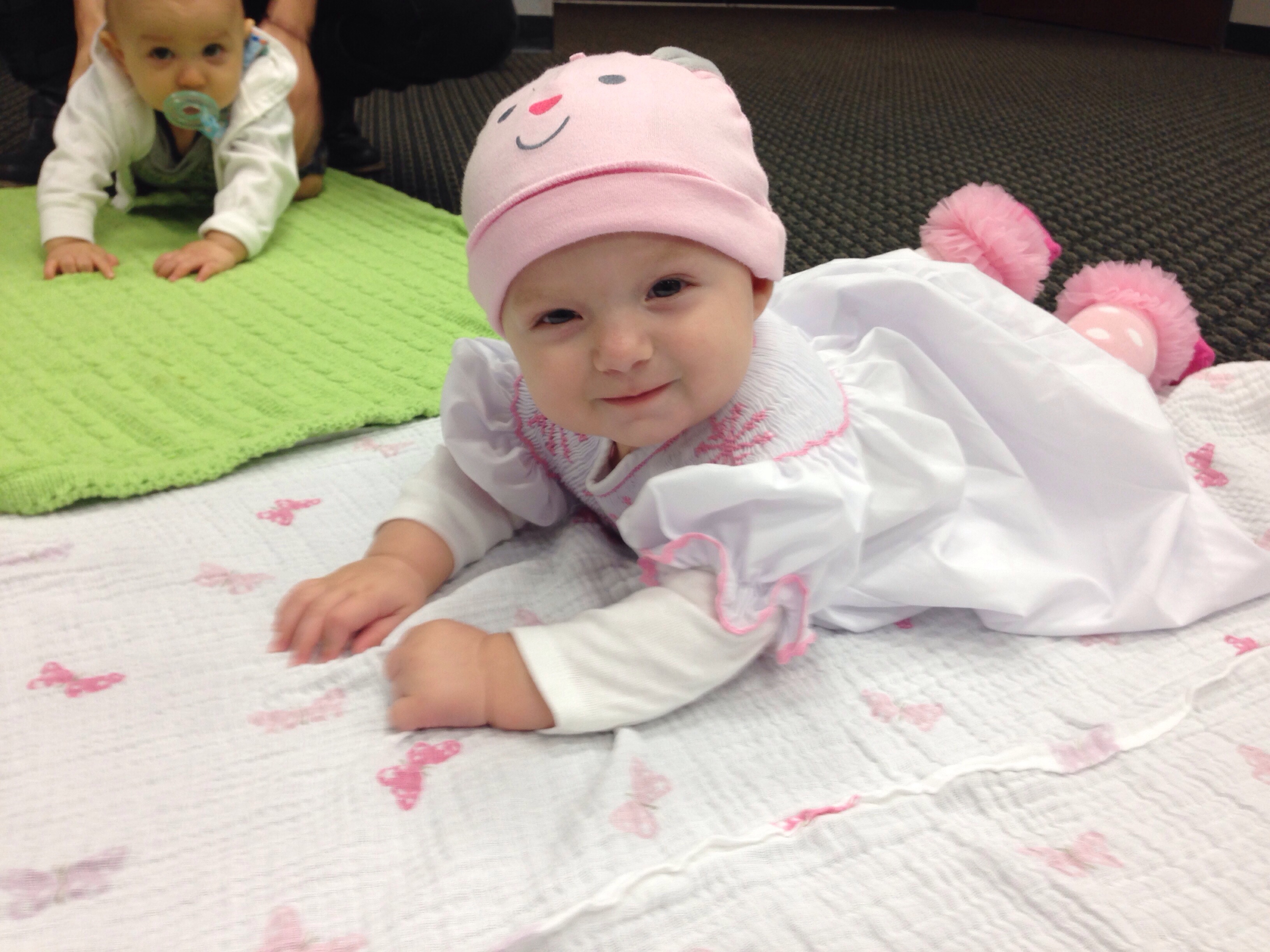 She’s sitting up by herself and she moves all around but not yet crawling, at least not forward. She kinda crawls backwards. Her first word was Dada and he was a very proud daddy.