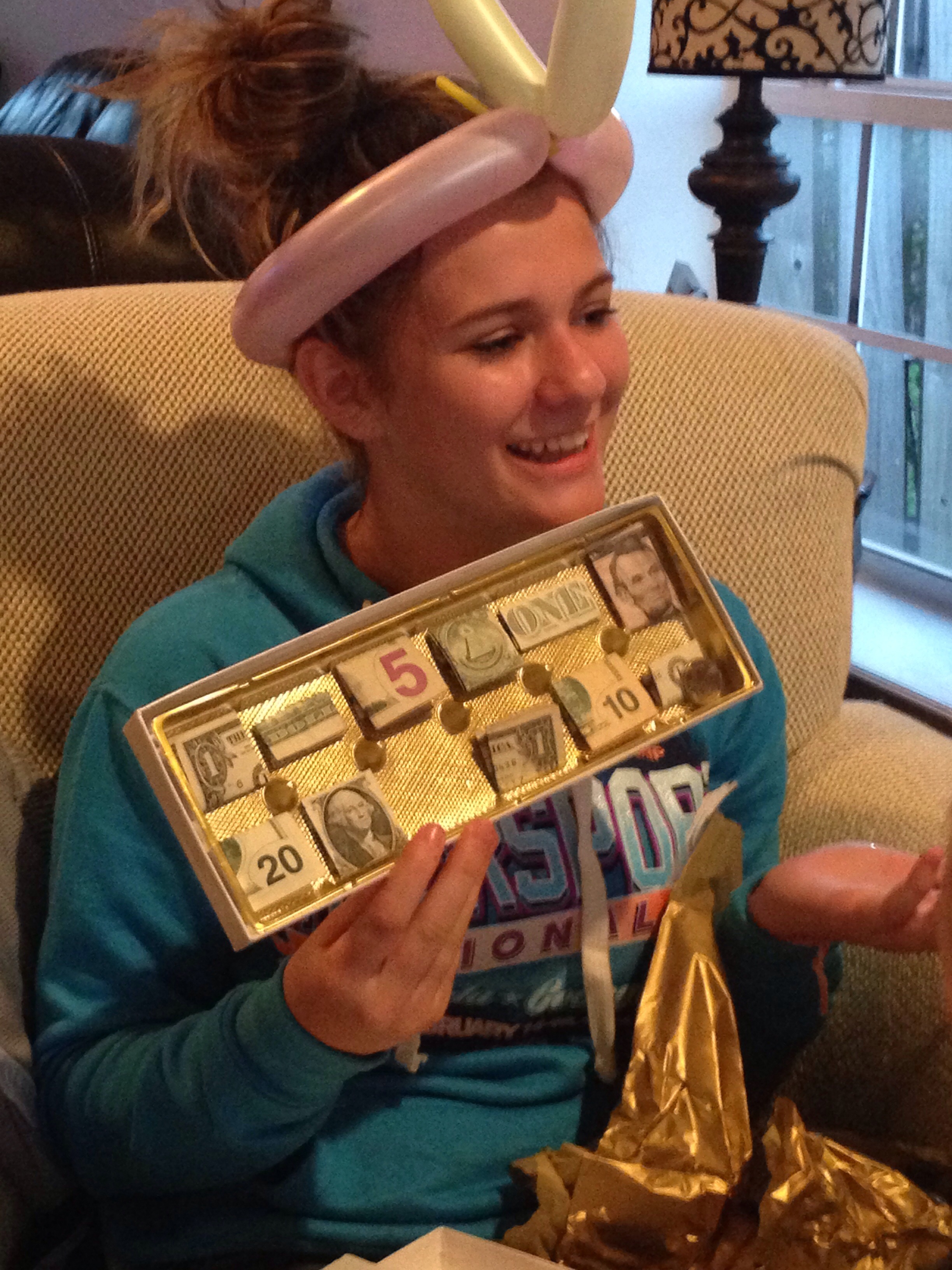 Jess and Matt gave her “cold hard cash” so money frozen in ice. Erica and John put money in the candy wrapper sections of a box of chocolates. We gave her “play doh” and just stuck cash in a play doh container. Toria taped together a bunch of ones and put it in a tissue box and wrote on it “don’t blow it all at once.” Thomas made her a balloon hat and she wore it for hours not realizing money was all inside the balloon.