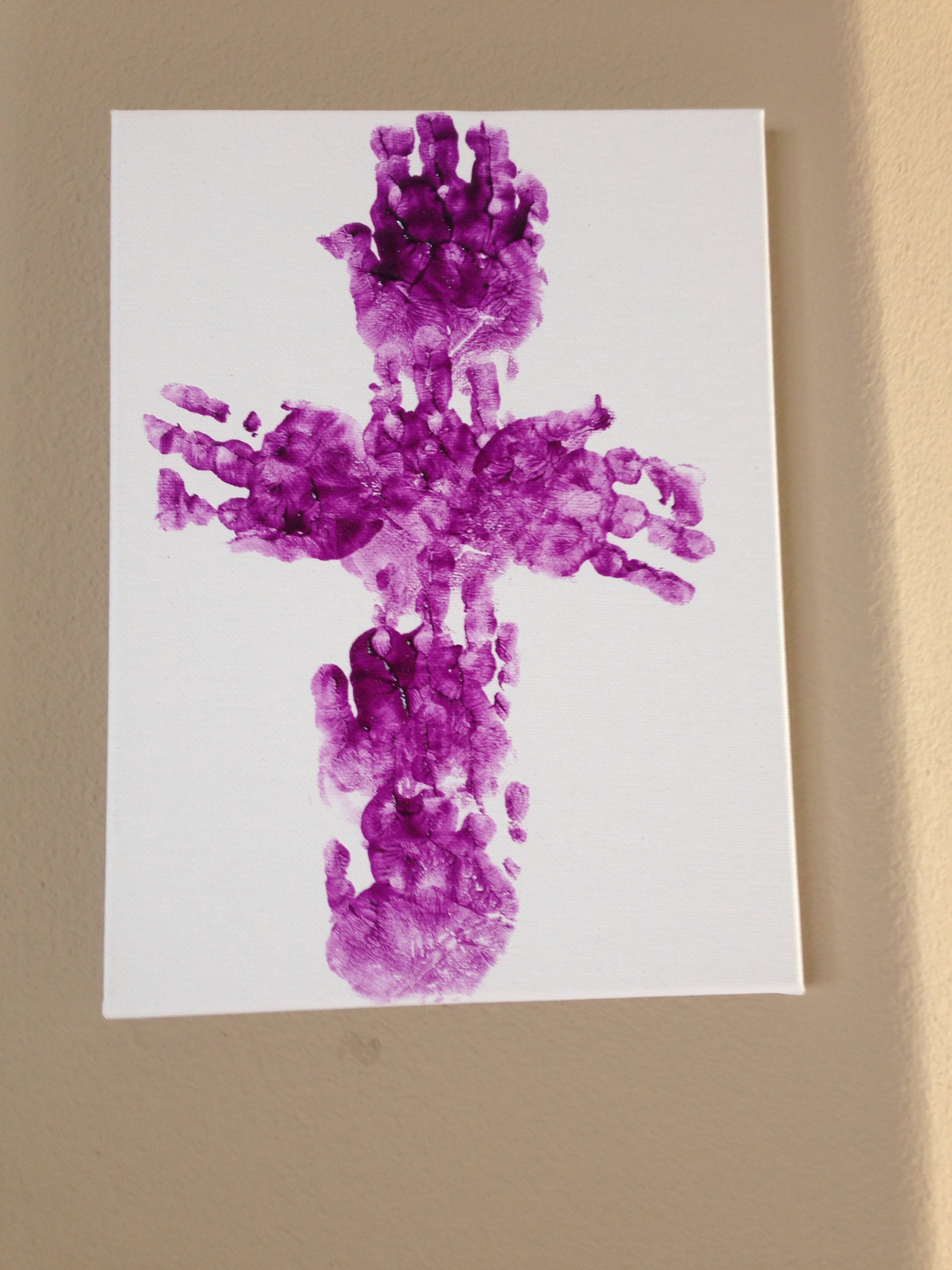 We also made a cross with Timmy’s hand going down in purple paint and Gracie’s handprints going across. I did this on canvas so it might become permanent decoration in this house.
