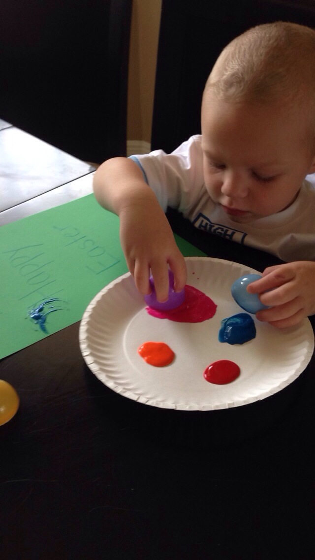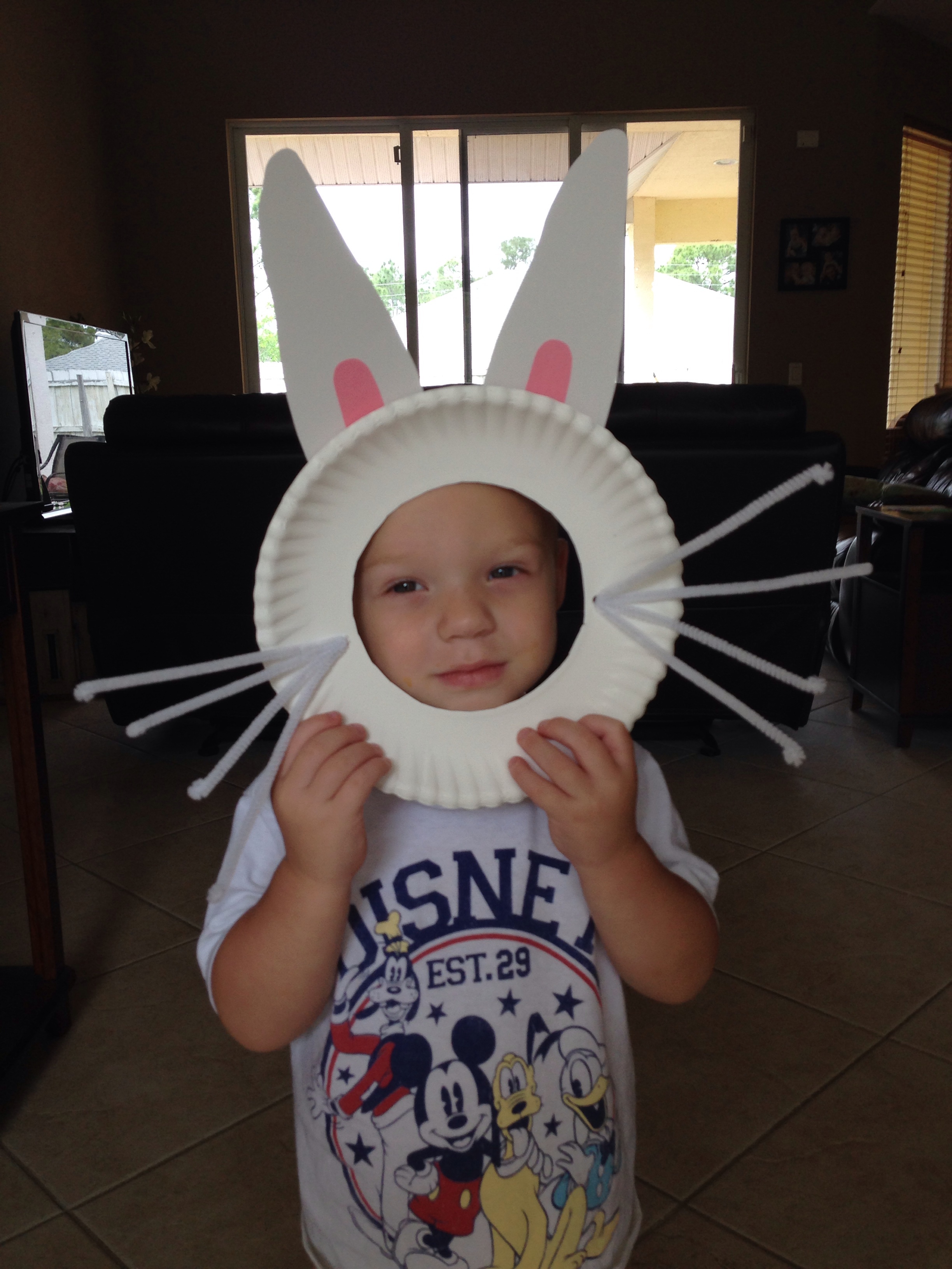 I made a bunny mask out of a paper plate, construction paper and pipe cleaners. Then we hopped around the house like bunnies. Now he wants to hop everywhere. And when he went to see the Easter bunny, first thing he said was “Bunny hop hop” so I think he got this lesson.