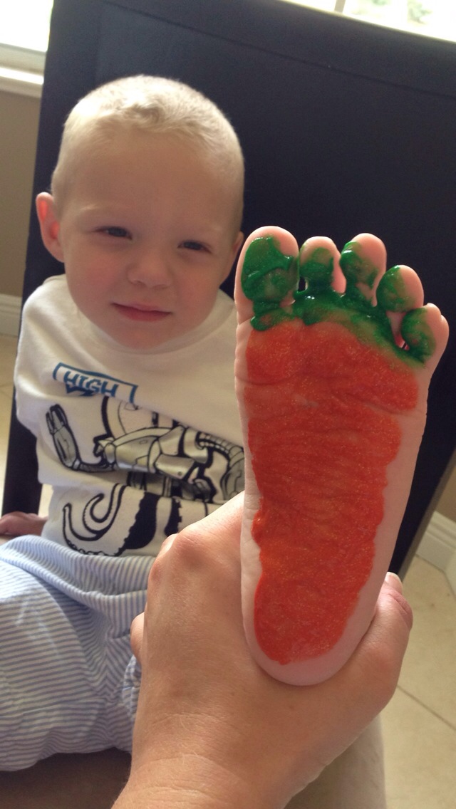 I love handprint/footprint anything of my babies so we made footprint carrots for an Easter decoration. I’m in love with it and the kids got a kick out of me painting their feet. Wipes have become a staple with paint supplies, makes clean up very quick and easy.