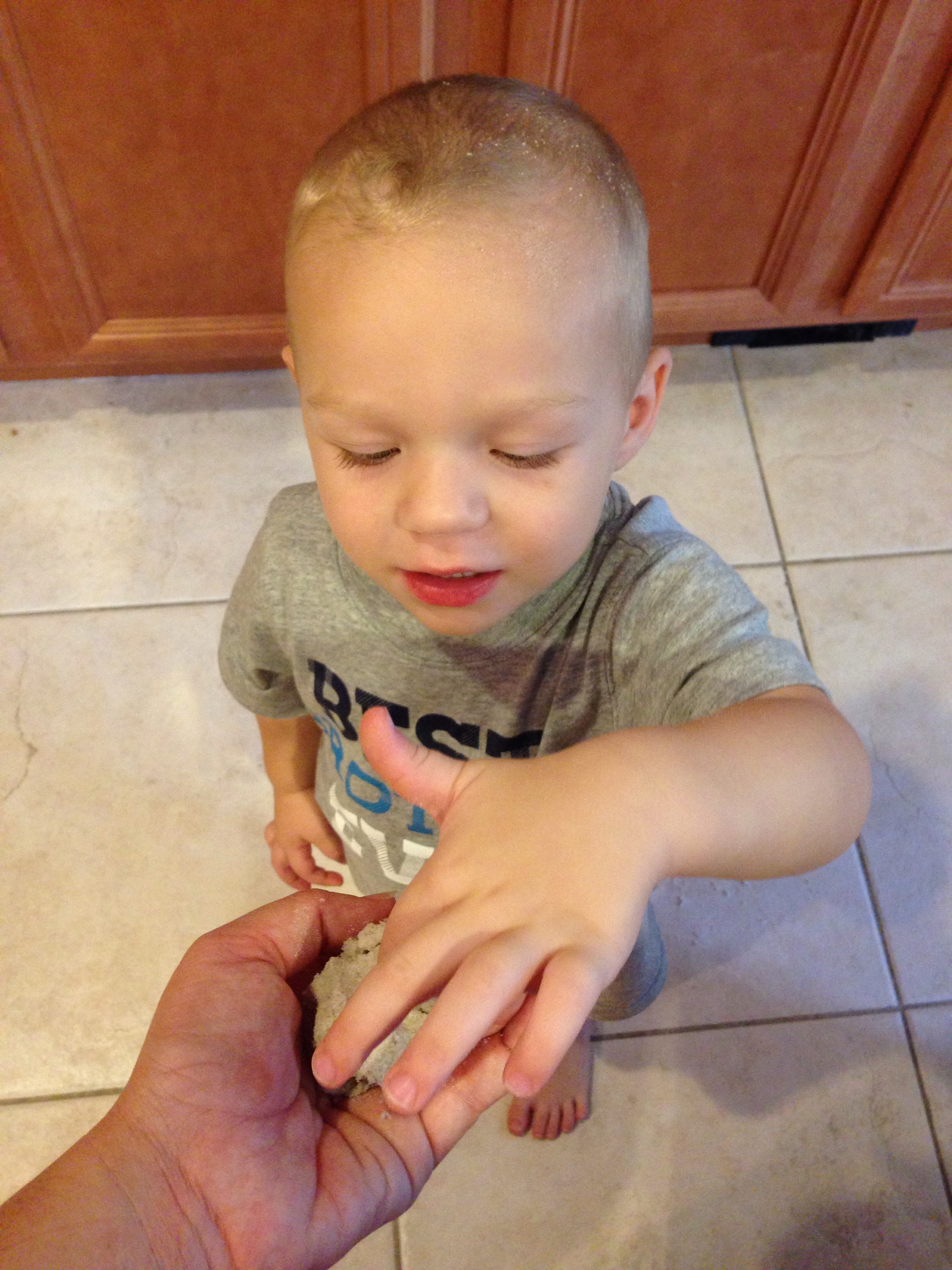 Now to the next lesson – making sand into a ball does not make it a rock. I’ve been handed these “rocks” twice already and now there’s sand everywhere.