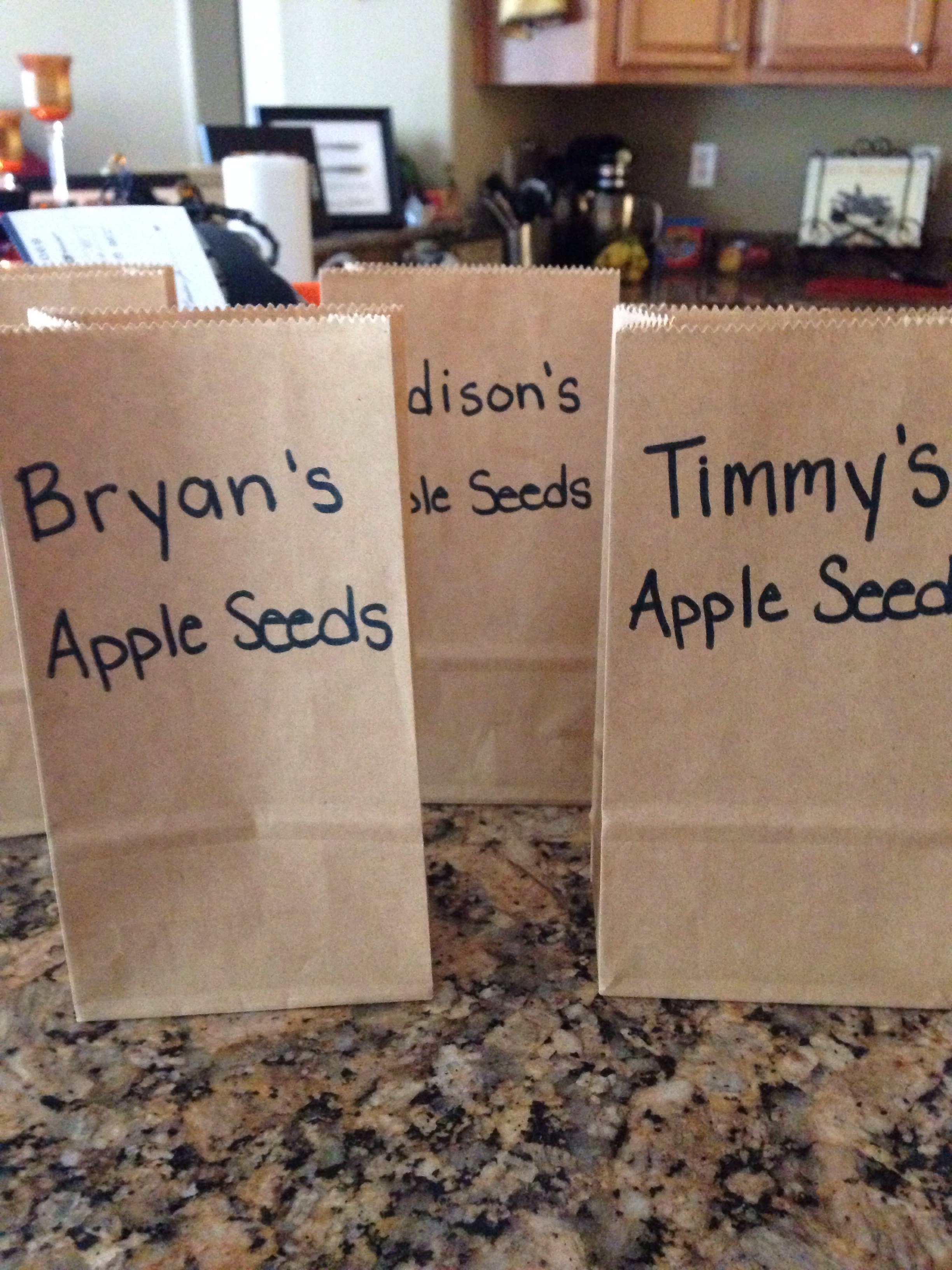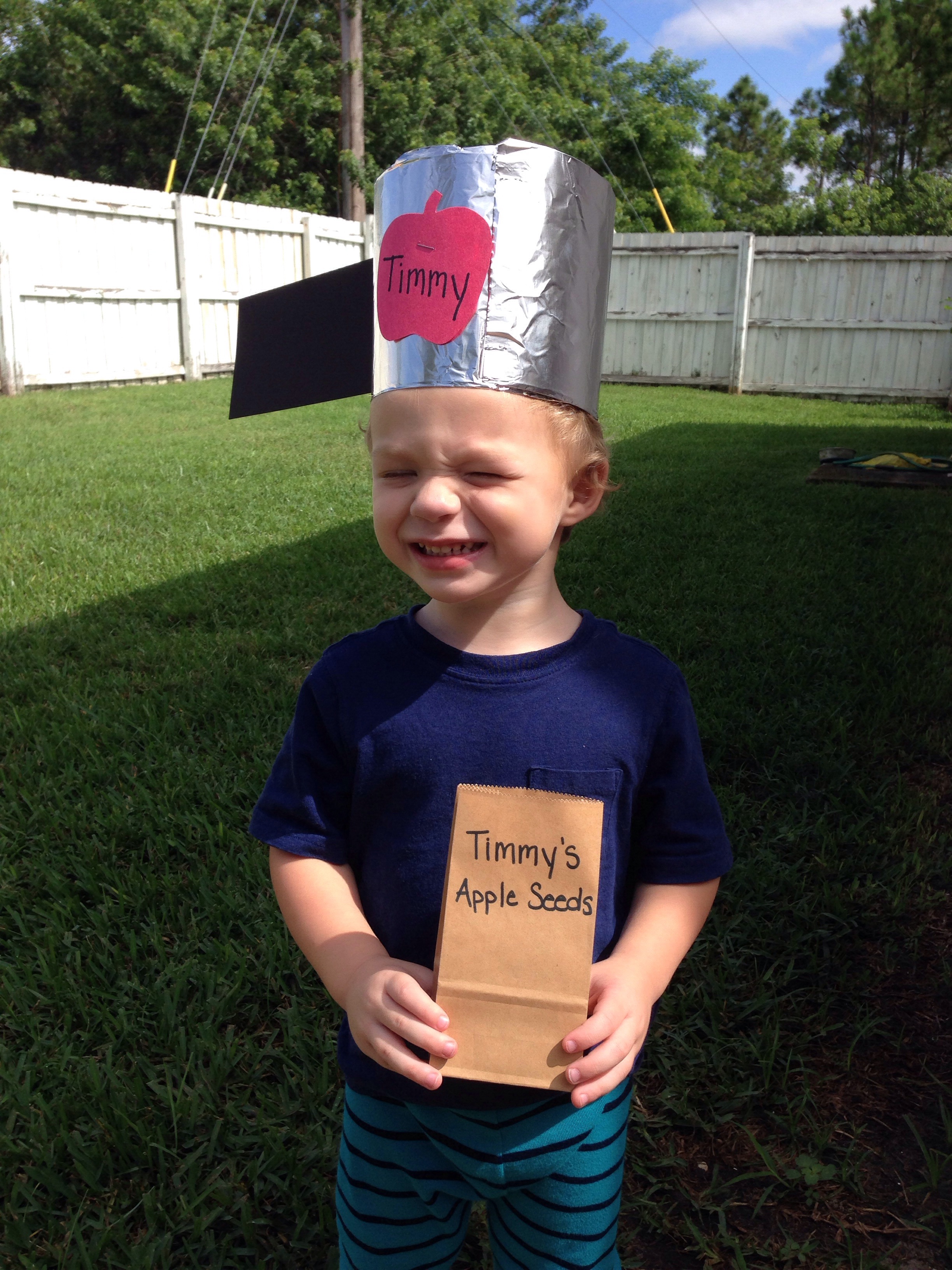 Then I read then the book about Johnny Appleseed. We measured their heads for their “pot” hats and went outside to plant our “appleseeds.”