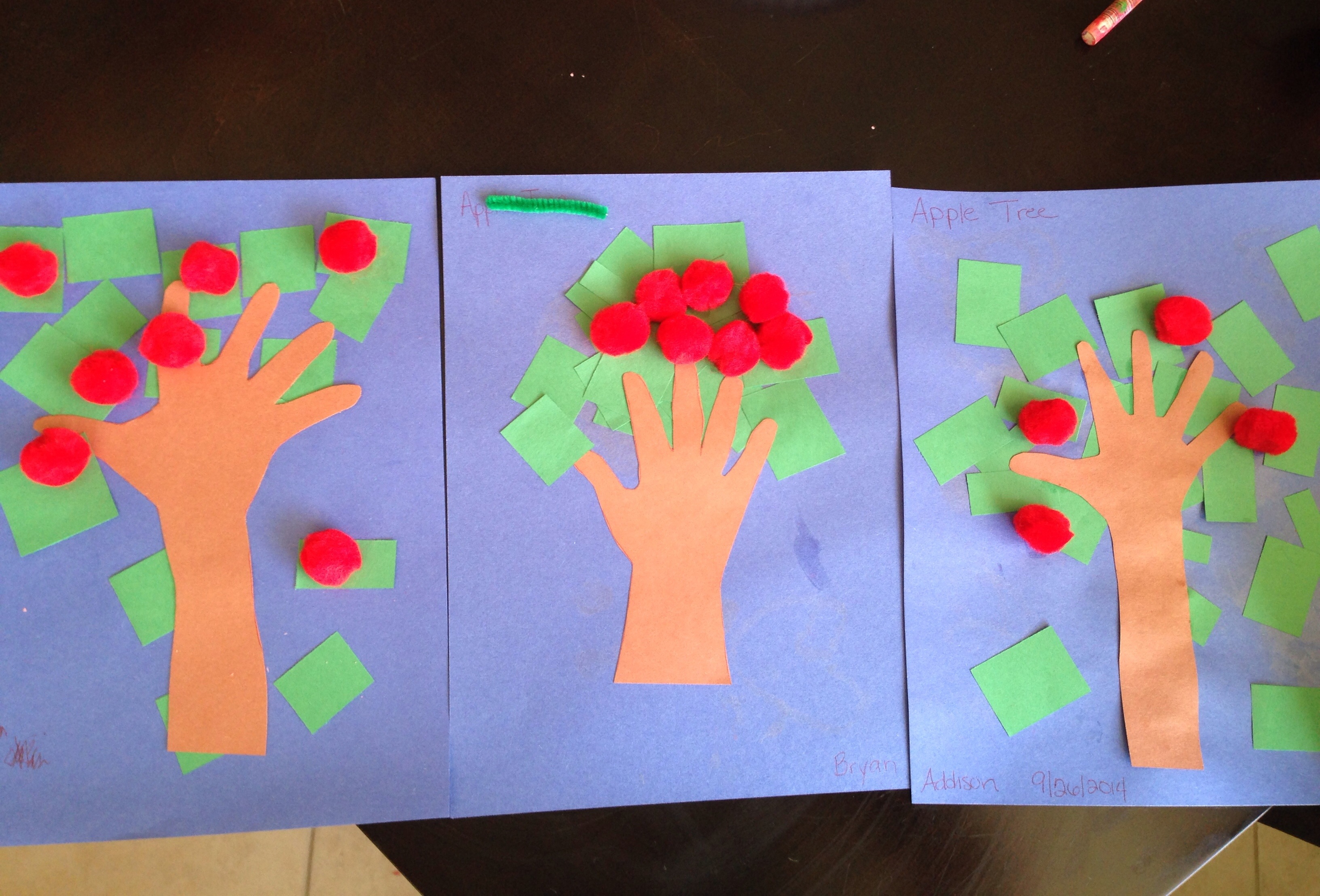 When we came inside we made handprint tracing apple trees with Pom Pom apples and a paper plate apple with a green handprint leaf & stem.