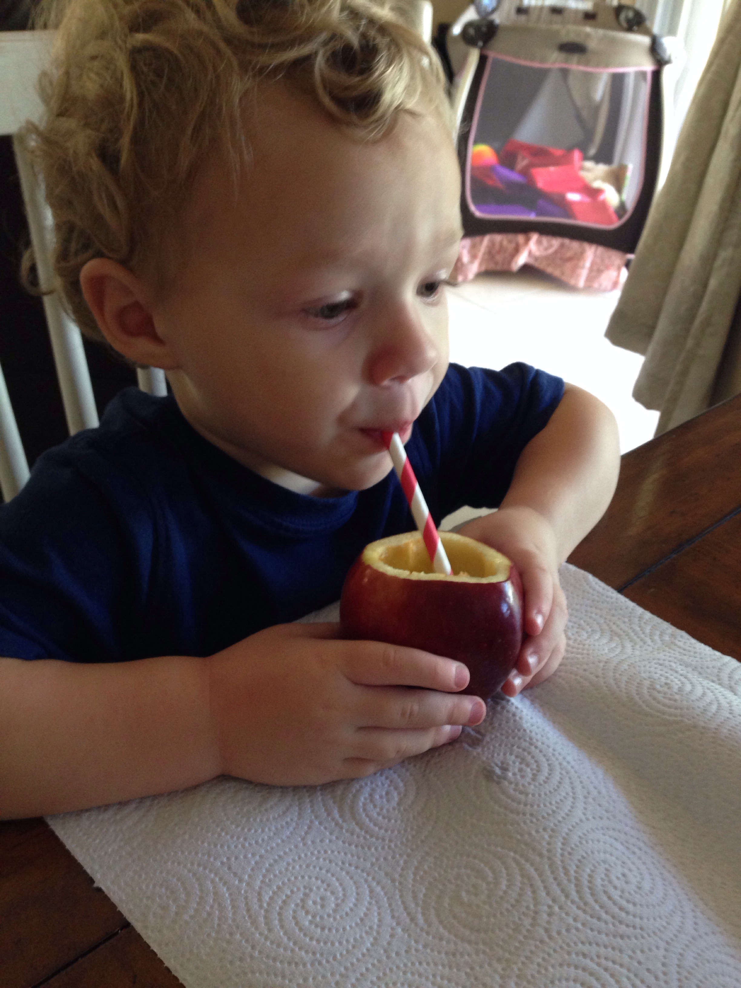 Then it was snack time! The idea was to read “How to Make an Apple Pie and See the World” but by this point the kids were over it and wanted to just play. I made an apple pie, crockpot applesauce and apple granola. I cored out apples for the kids and poured apple juice inside with little straws. It was so cute.
