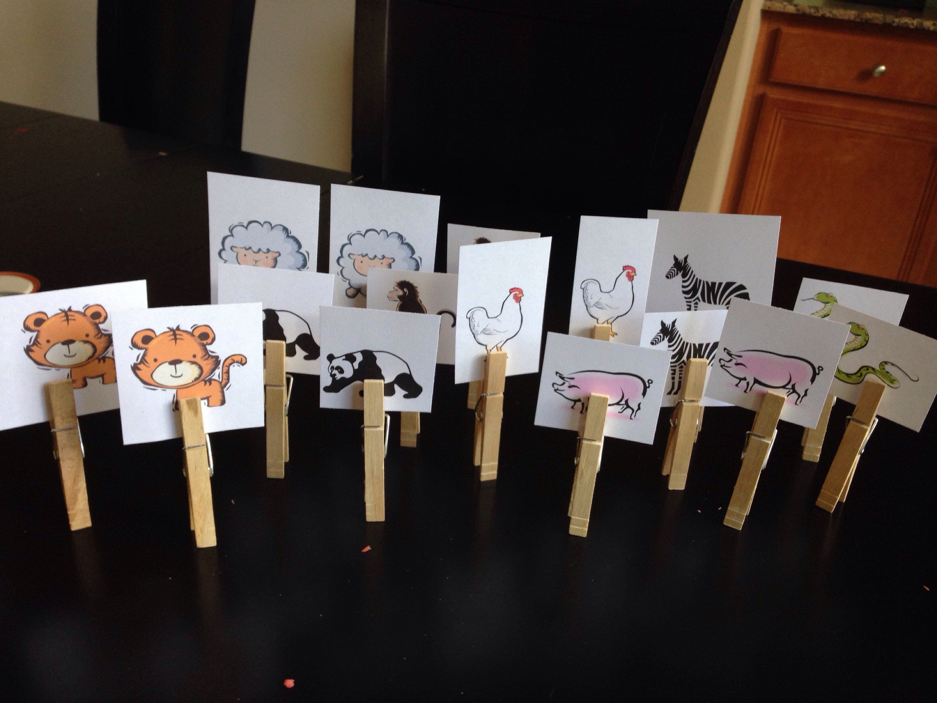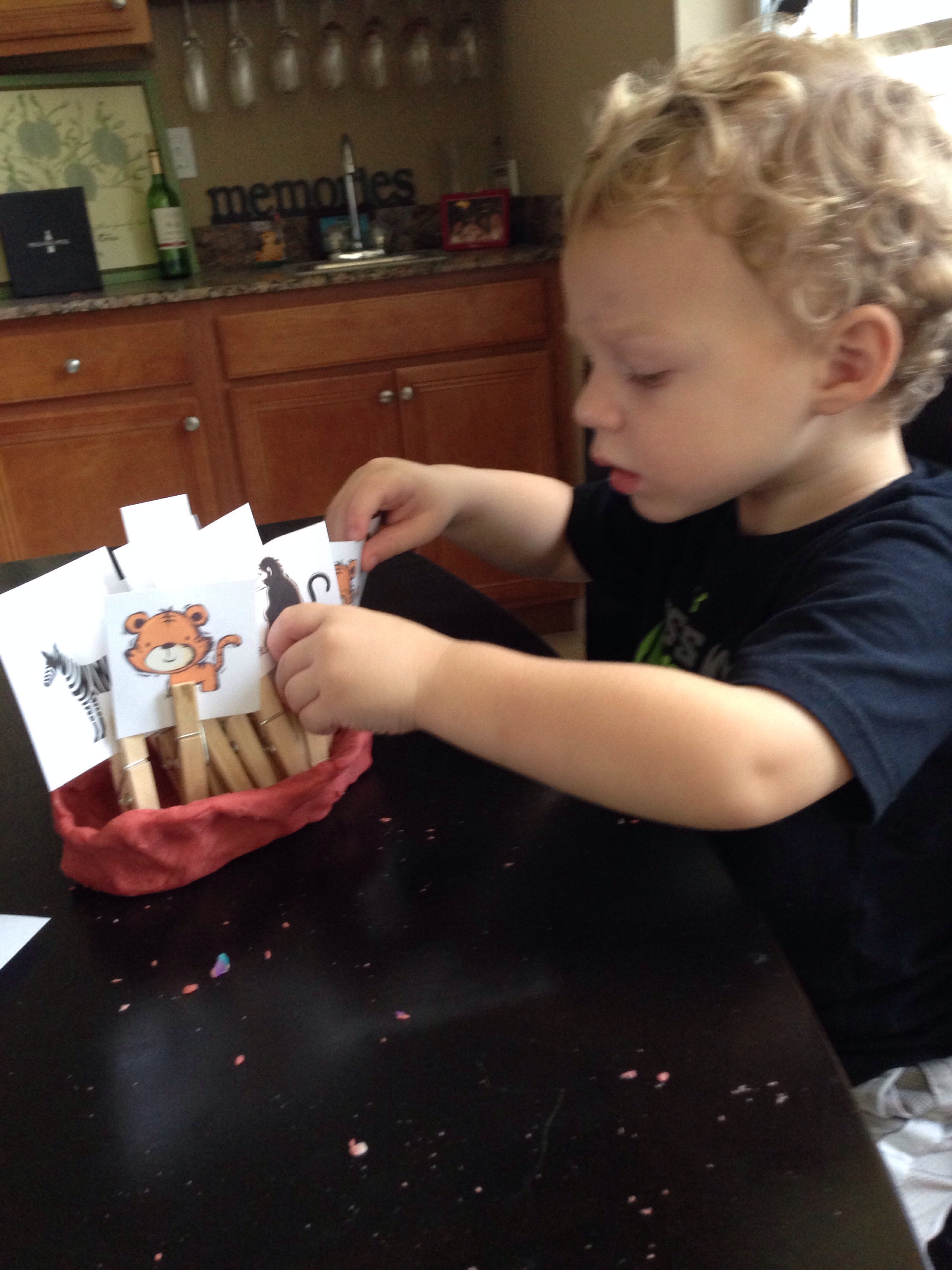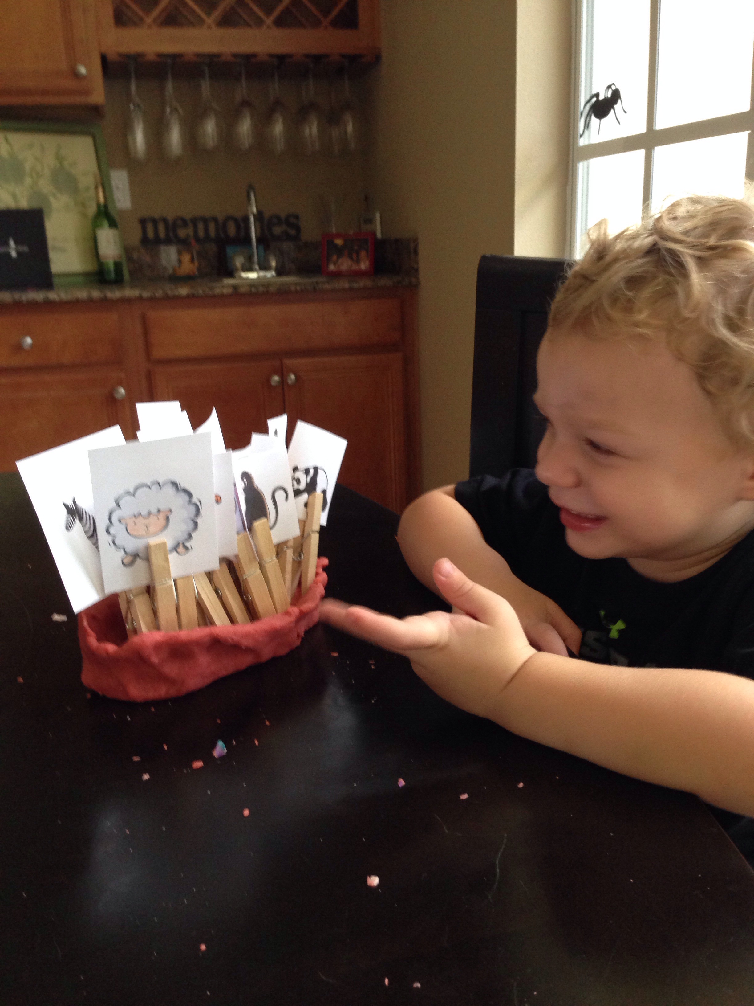 I just took clip art animals, clothes pins and playdough and let him play. He was determined to get every animal in the boat.