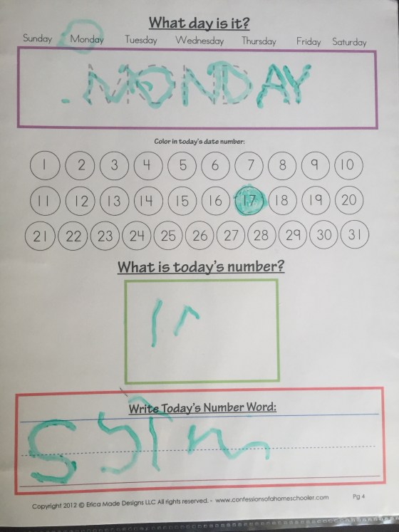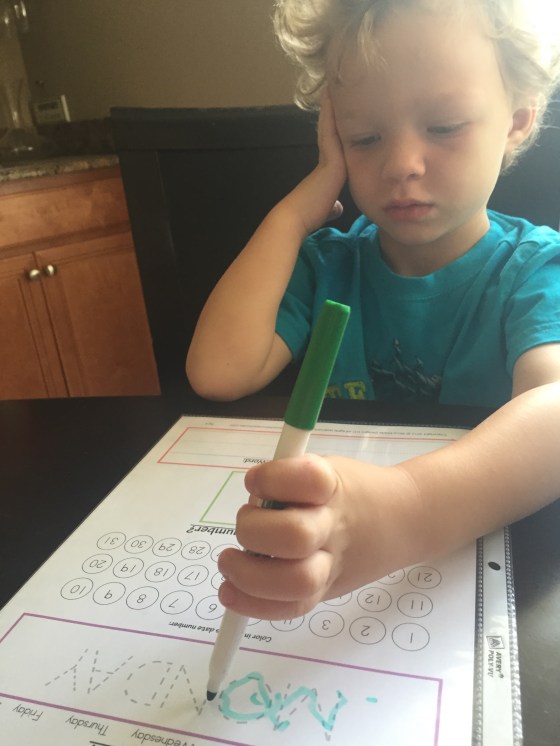 I did have a small set back. On the first day when I told them it was time for school and we sat down at the table Timmy asked why he wasn’t at a red school and where were all his friends. My heart broke a little. However even if our intentions weren’t to homeschool he would not yet be in preschool. So I’m glad I’m starting early so that this will be normal for him once kindergarten starts in 2 years.