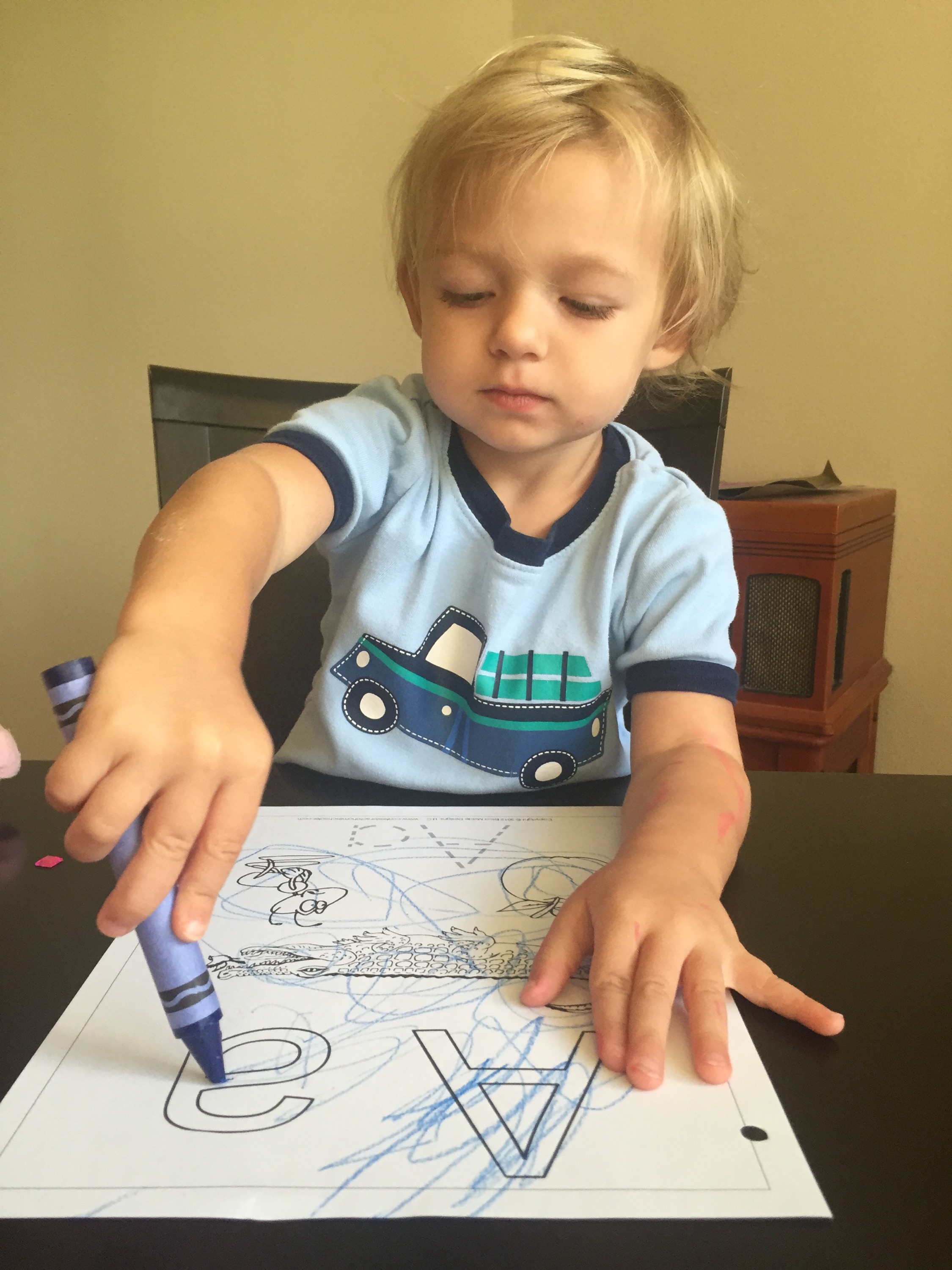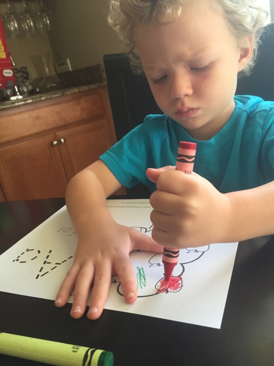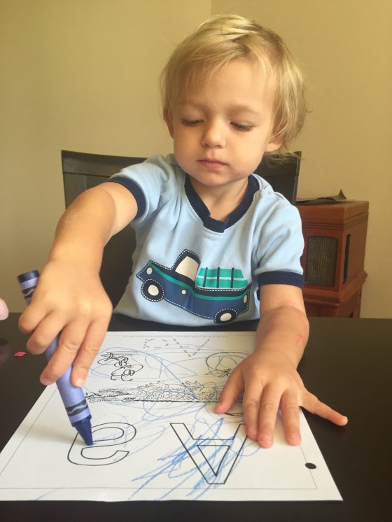 Gracie joined in when she wanted. She wants to be big so I just let her choose what she wants to be a part of. We colored a Letter A page. Timmy is very serious about staying in the lines and Grace not so much.