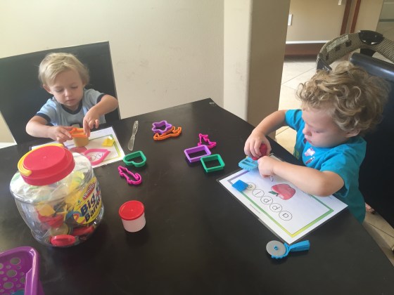 They love Playdoh. I gave them a Letter A stamp, cookie cutters and a plastic knife. Easily their favorite thing, if only it wasn’t so messy. I bought this playdoh at Dollar Tree, $1 for a 4 pack and it’s very comparable to the name brand and much easier to throw away when it gets gross π.