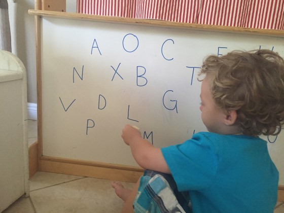 I wrote all the letters on a white board and he had to match the magnetic letter to it and then put it in the leap frog to hear it’s sound. This was a big hit.