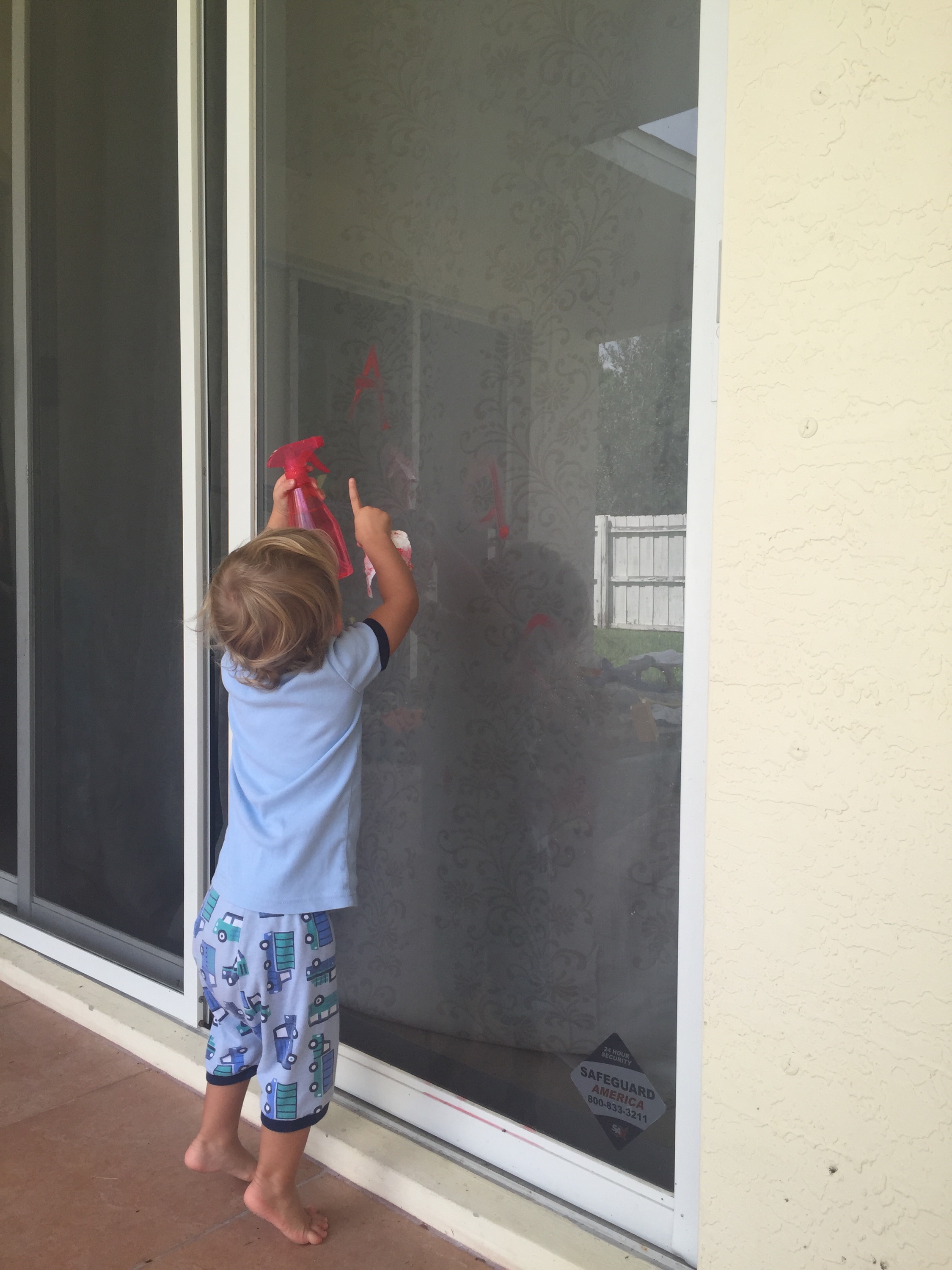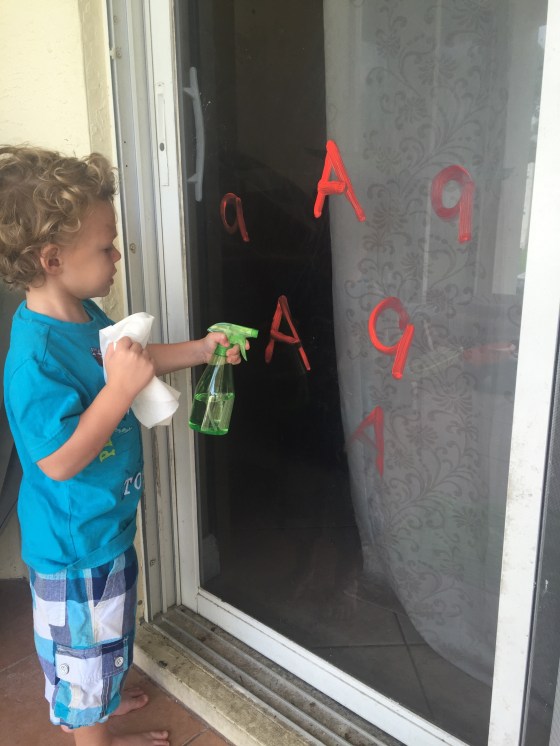 I used a car window marker and wrote the letter A on my sliders. Then gave them a water spray bottle and paper towel and told them to clean up. They love cleaning.
