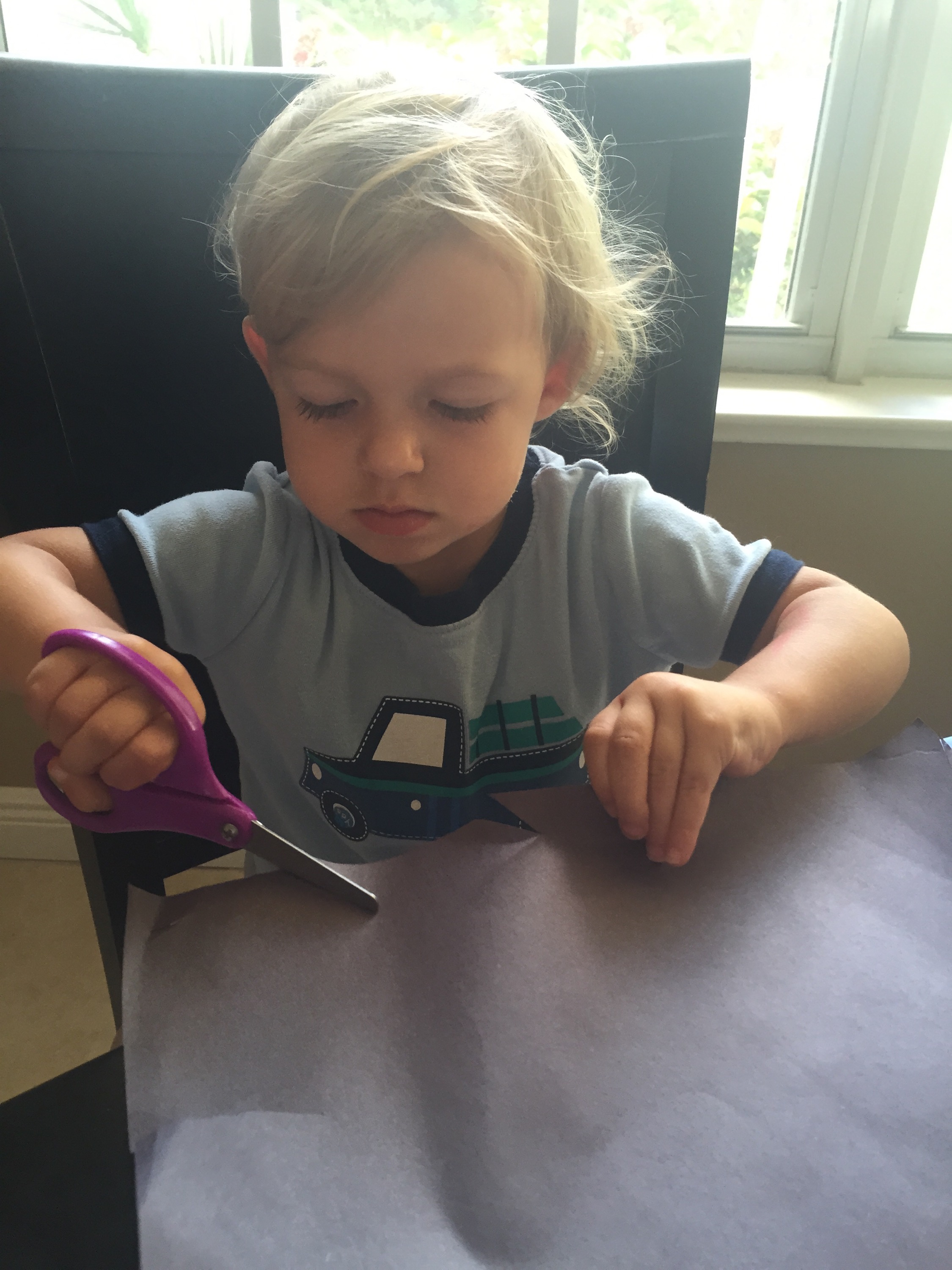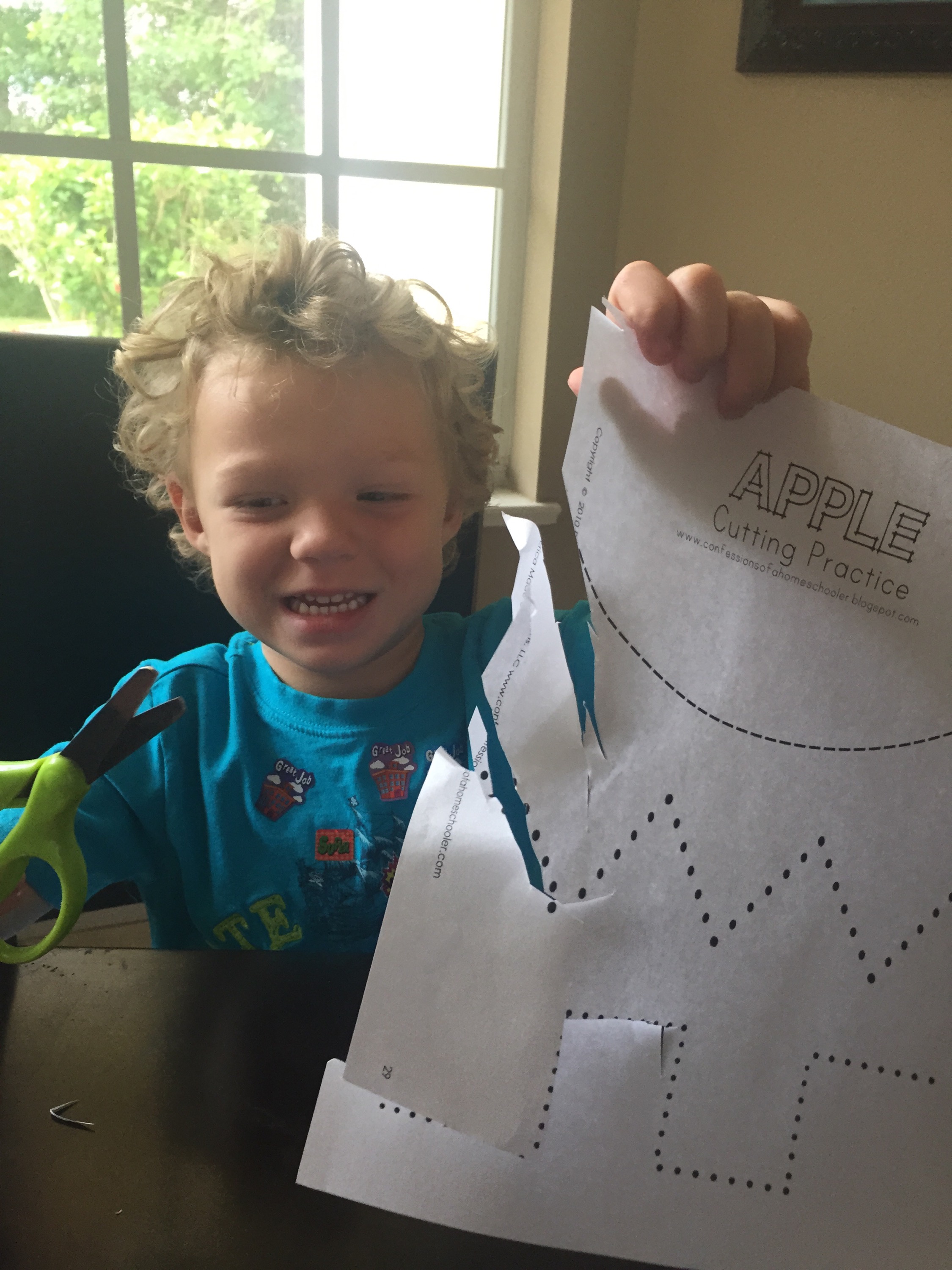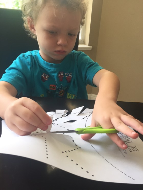 We practiced cutting. I was so surprised how well they both did. I forgot to get Timmy left handed scissors but these still worked.