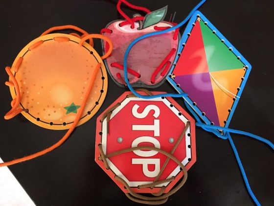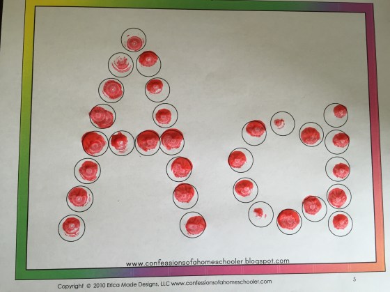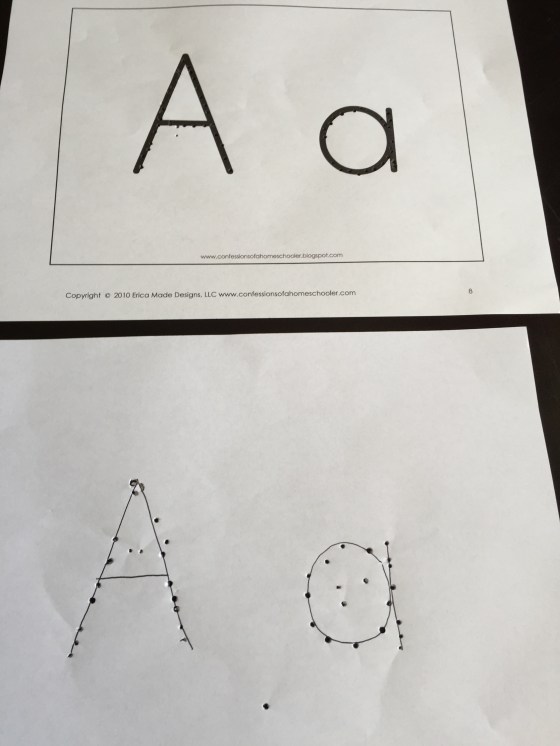 With this they had to poke a toothpick through the letter outline. They both did it by themselves. Again mama was amazed.
