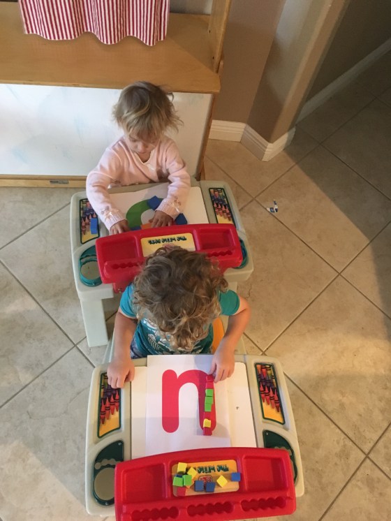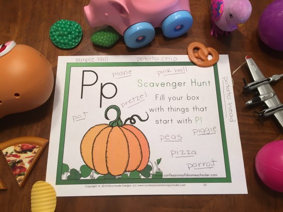 We did a Letter P scavenger hunt and then they named what we found and I wrote it down. They loved this. It helps that every toy we own right now is perfectly spread out aka total mess.
