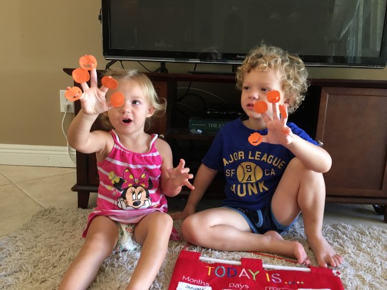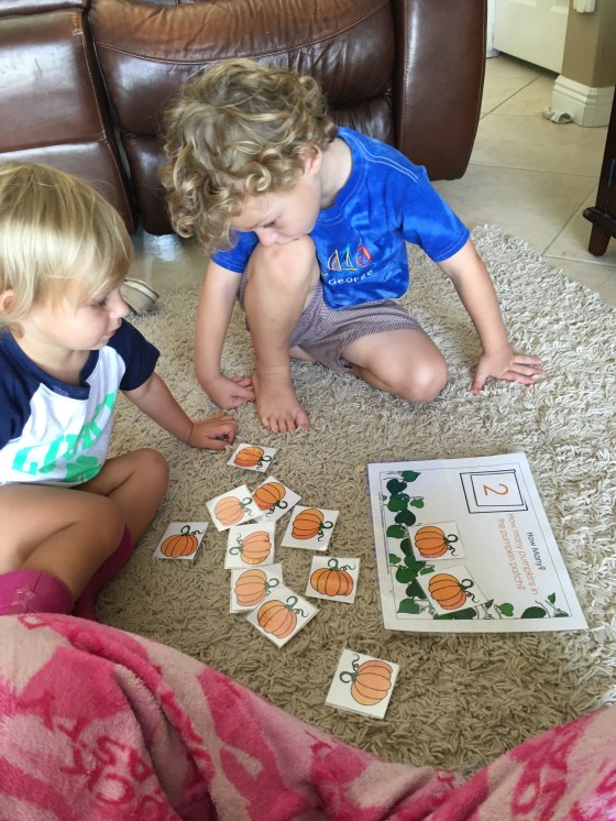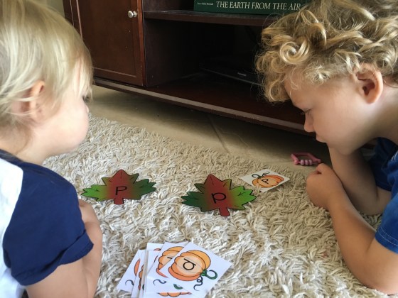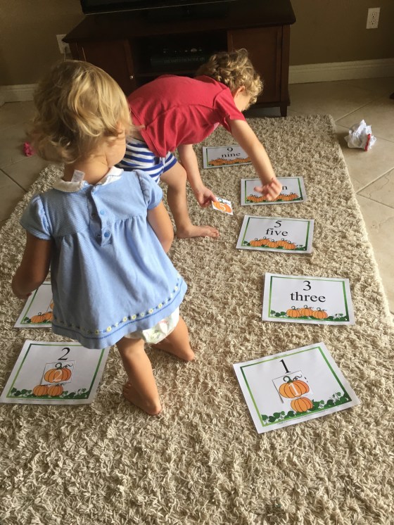 Added to our morning circle routine was the “Five Little Pumpkins” song. They both loved it.