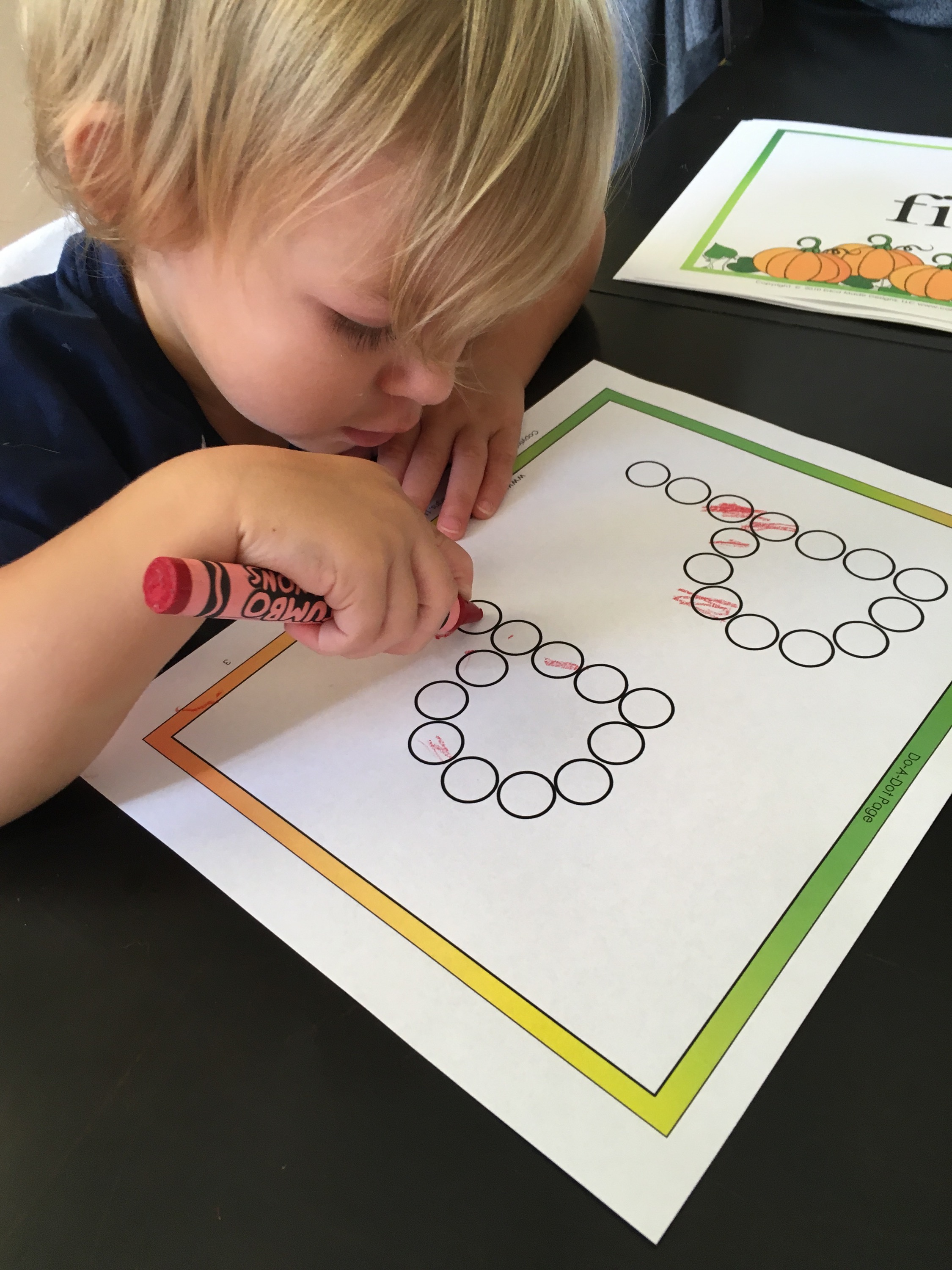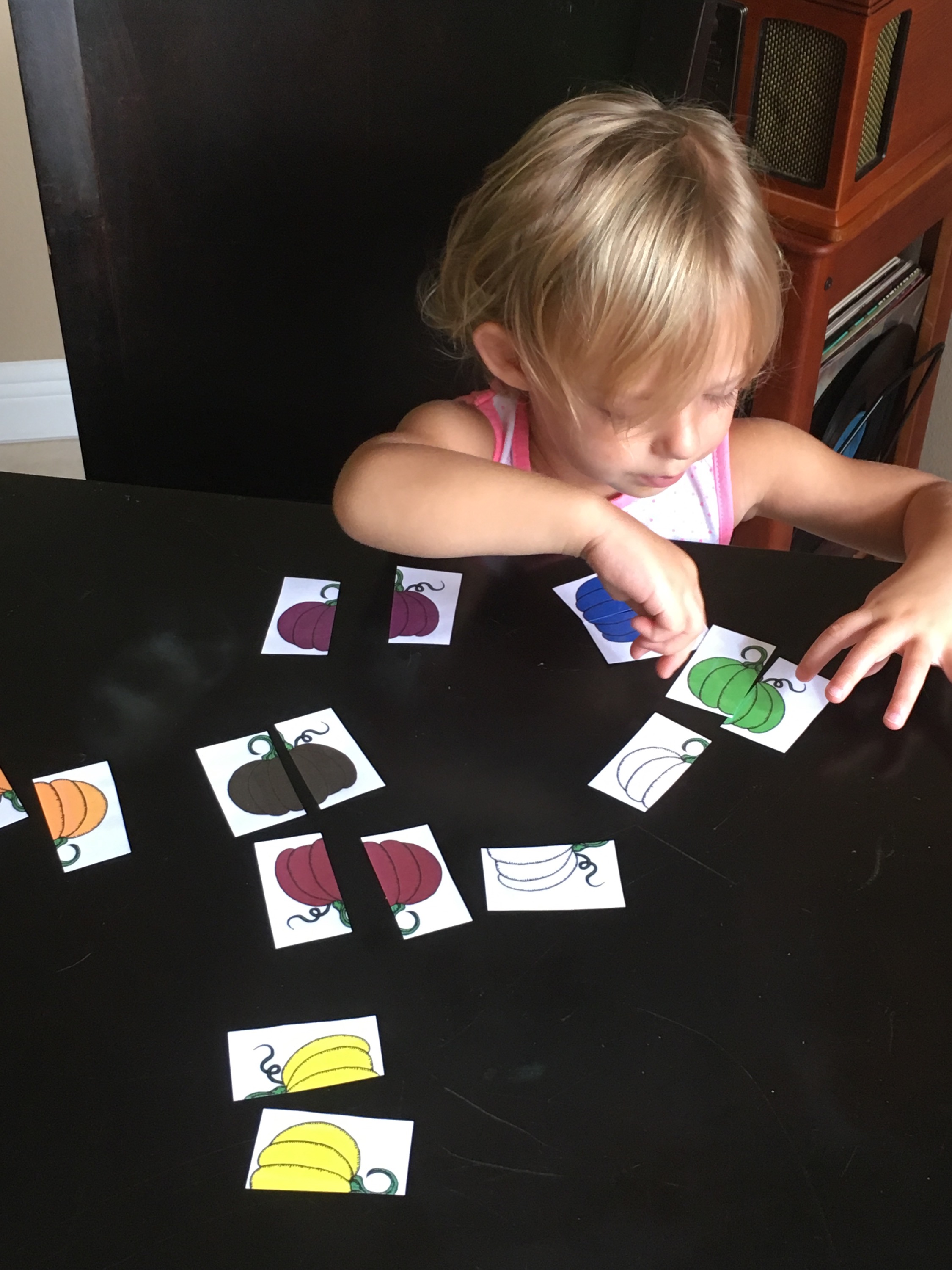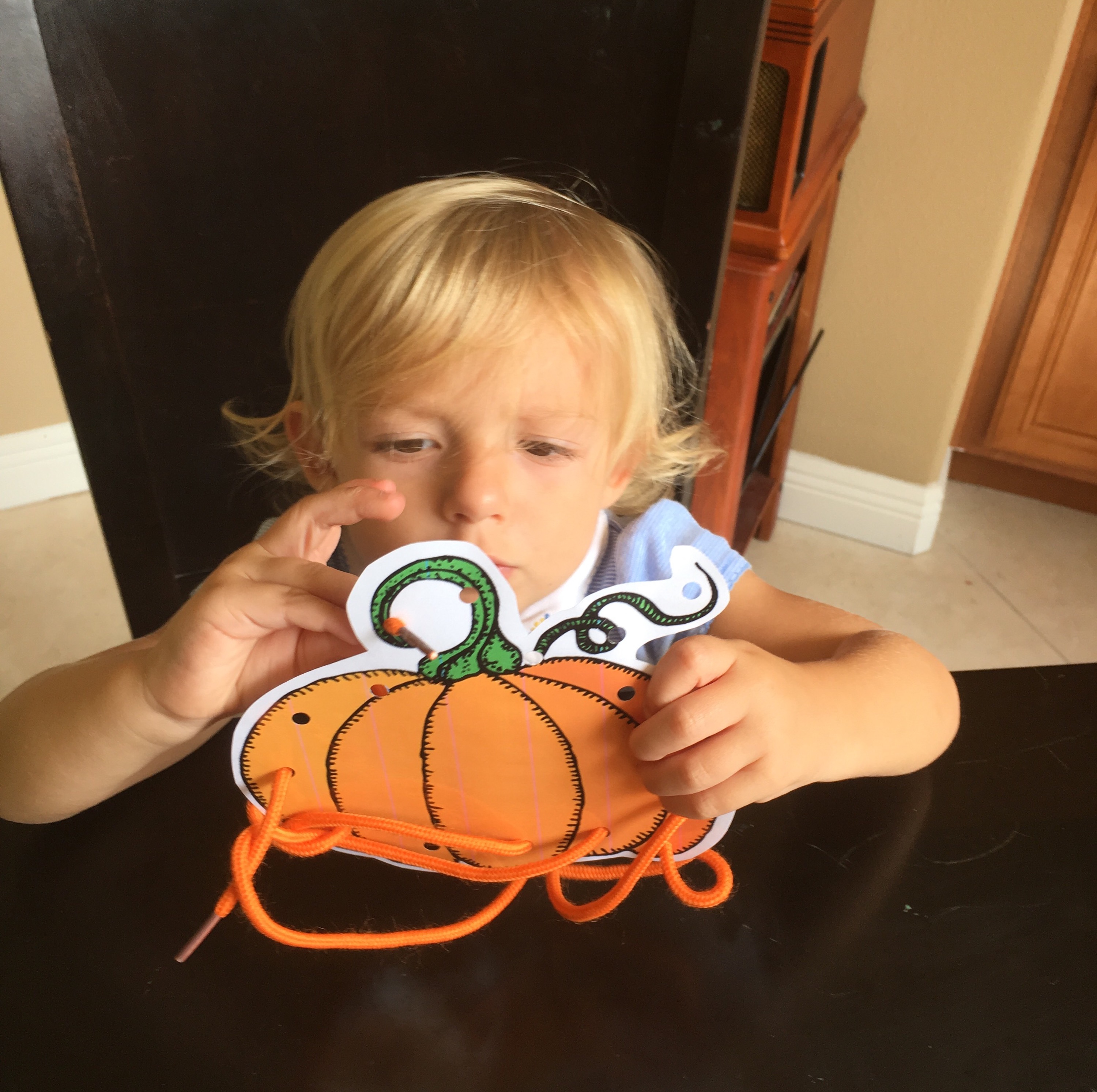 Grace was so serious about this lacing pumpkin. When I would try to take a picture she would say not yet mom I’m not done. She’s so cute and I love how she loves to learn.