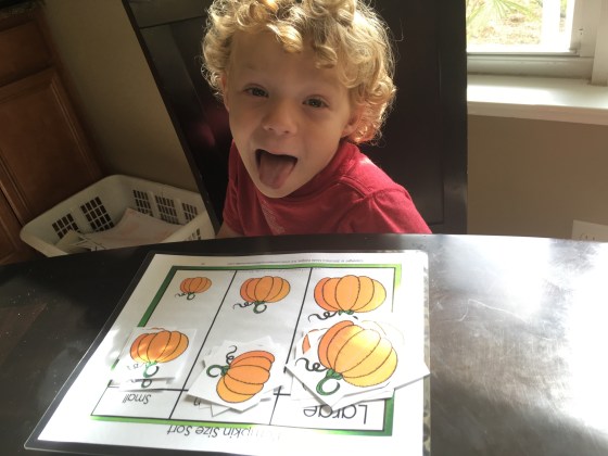 Timmy did a size sorting activity while Grace did the lacing pumpkin. I’ve started giving him direction and walking away and then come back to check his work. It is amazing to me how much he can do on his own. He only got one wrong.