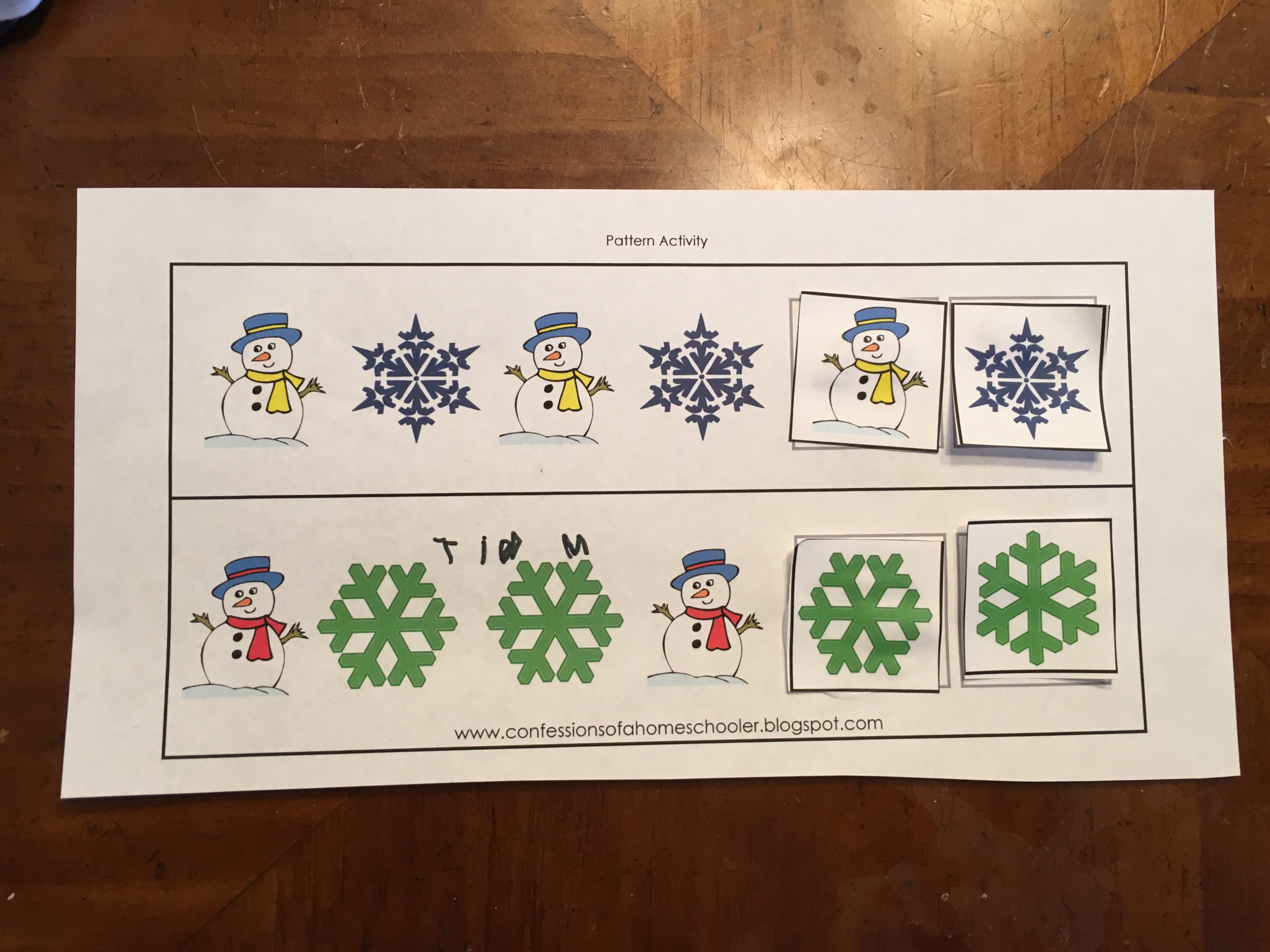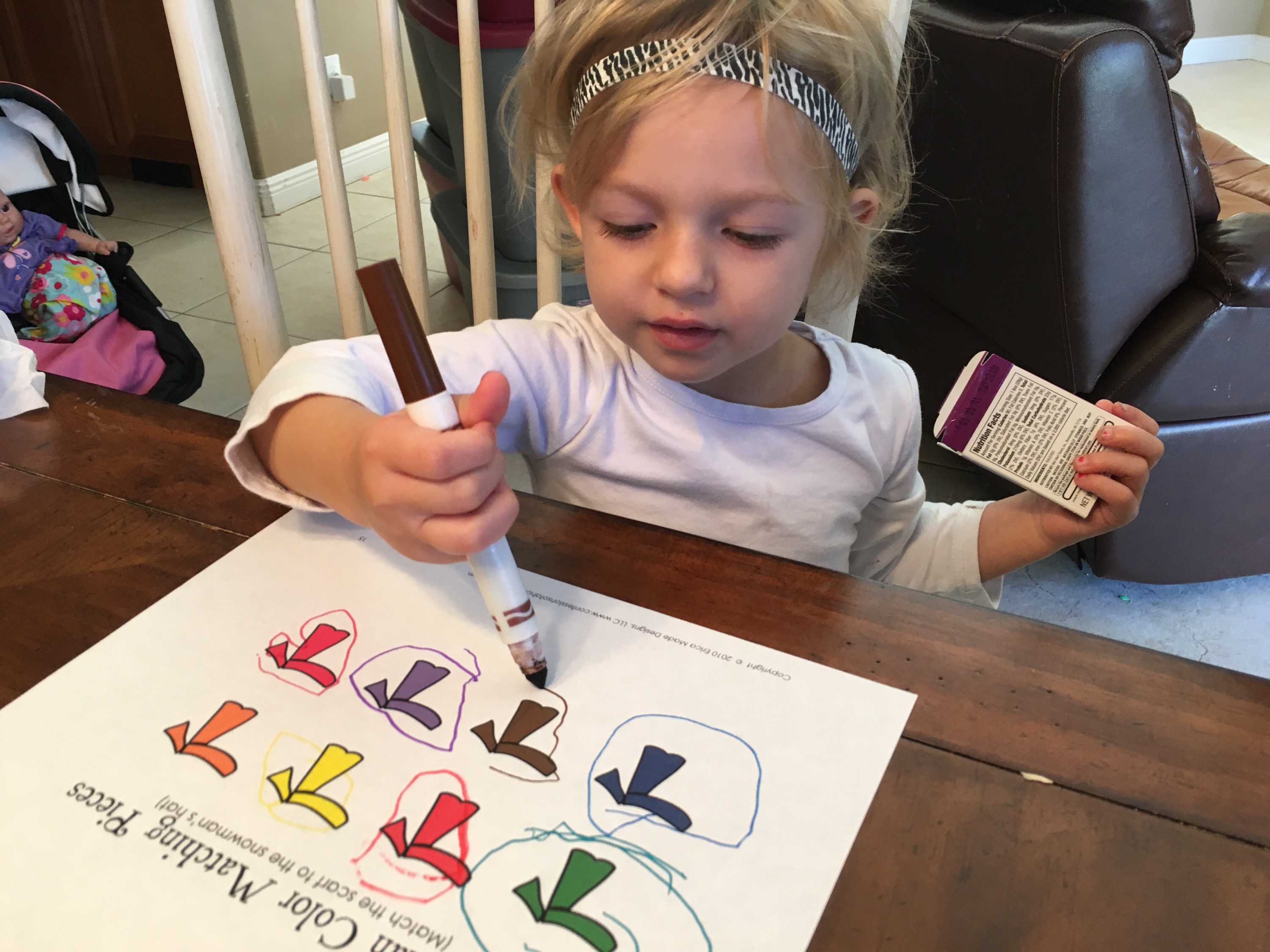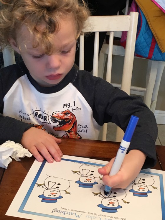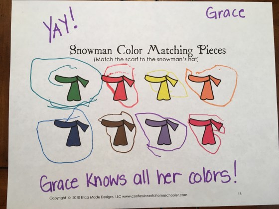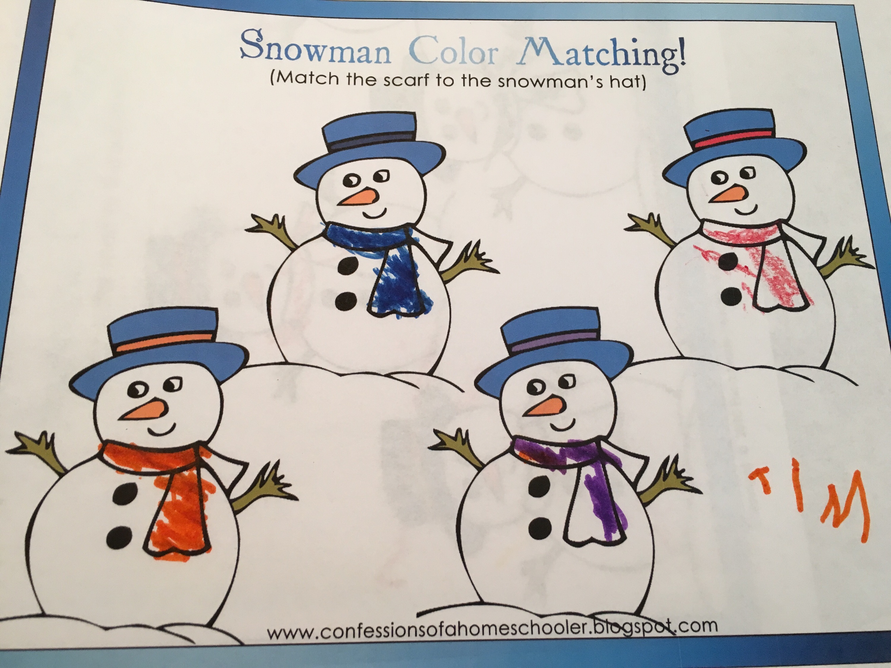 Today’s school work started with coloring snowmen scarves to match their hat brims.