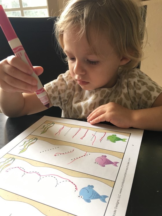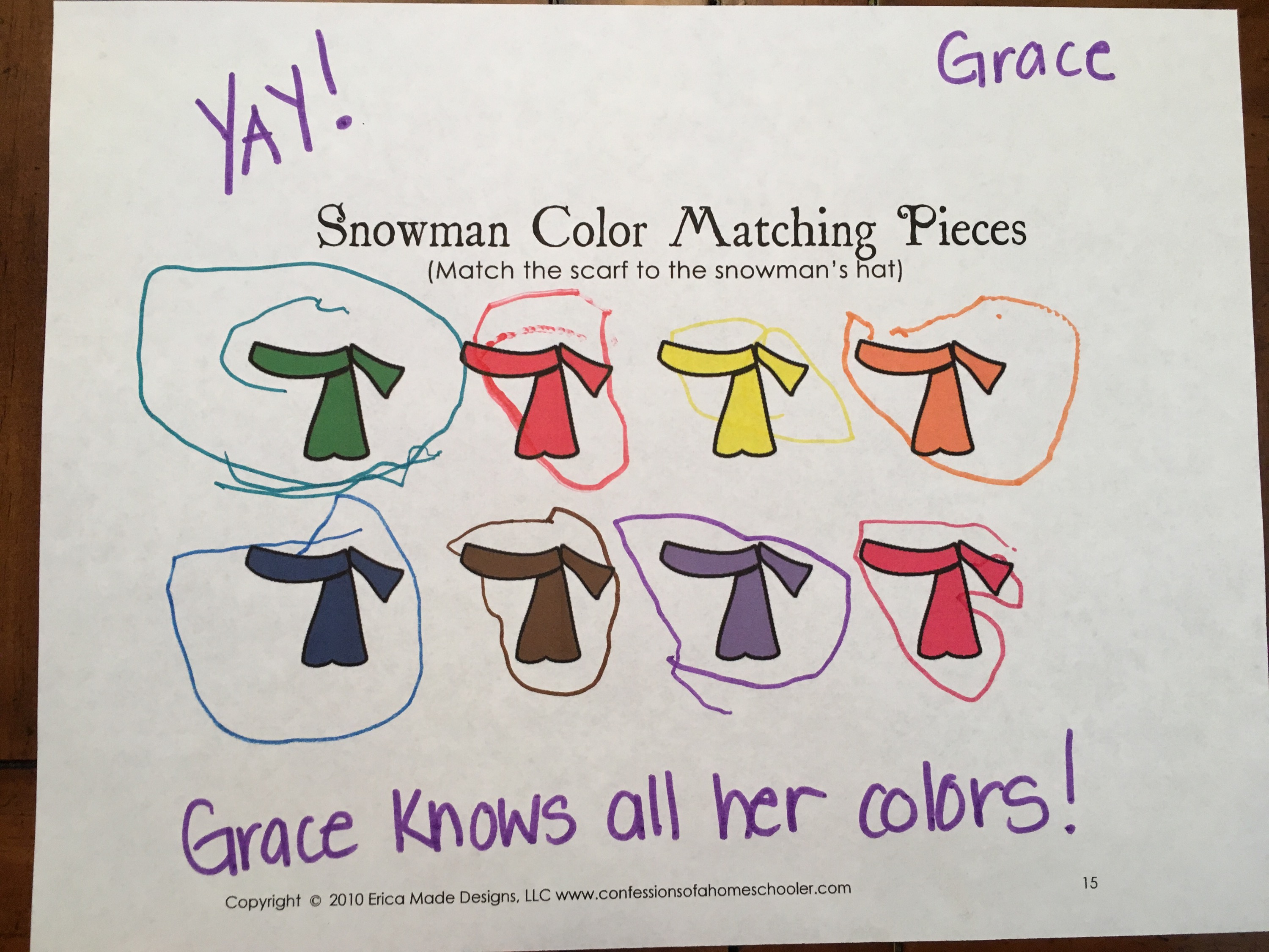 While Timmy worked on handwriting Grace did another color recognition worksheet. She had to circle the color scarf with the same color marker. Girl is a genius in my book.