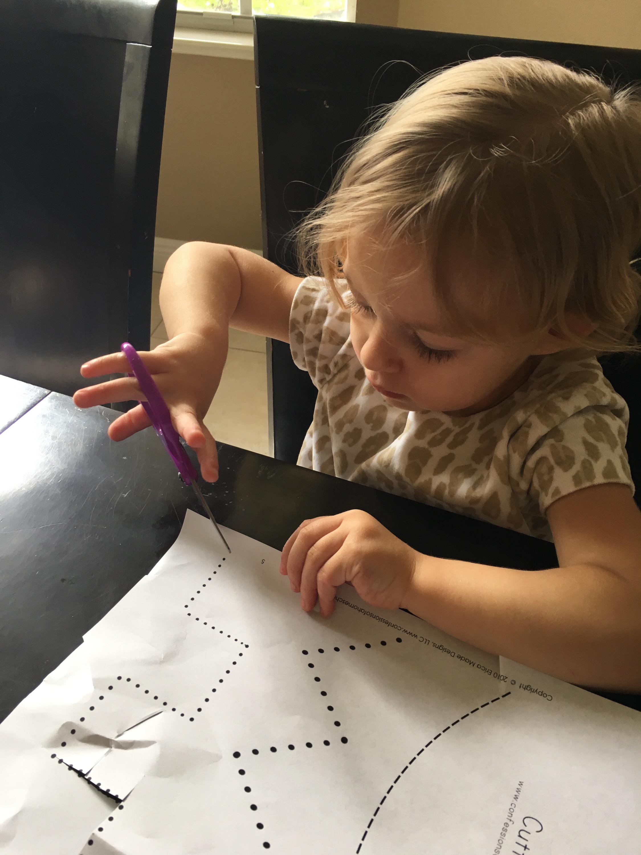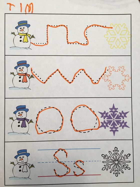 We started by tracing the Letter S. I told them to trace it 10 times. Then Timmy did a practice cutting page. After that I gave him pieces of a snowman to cut out and paste onto blue paper. For Grace I cut her pieces out for her.