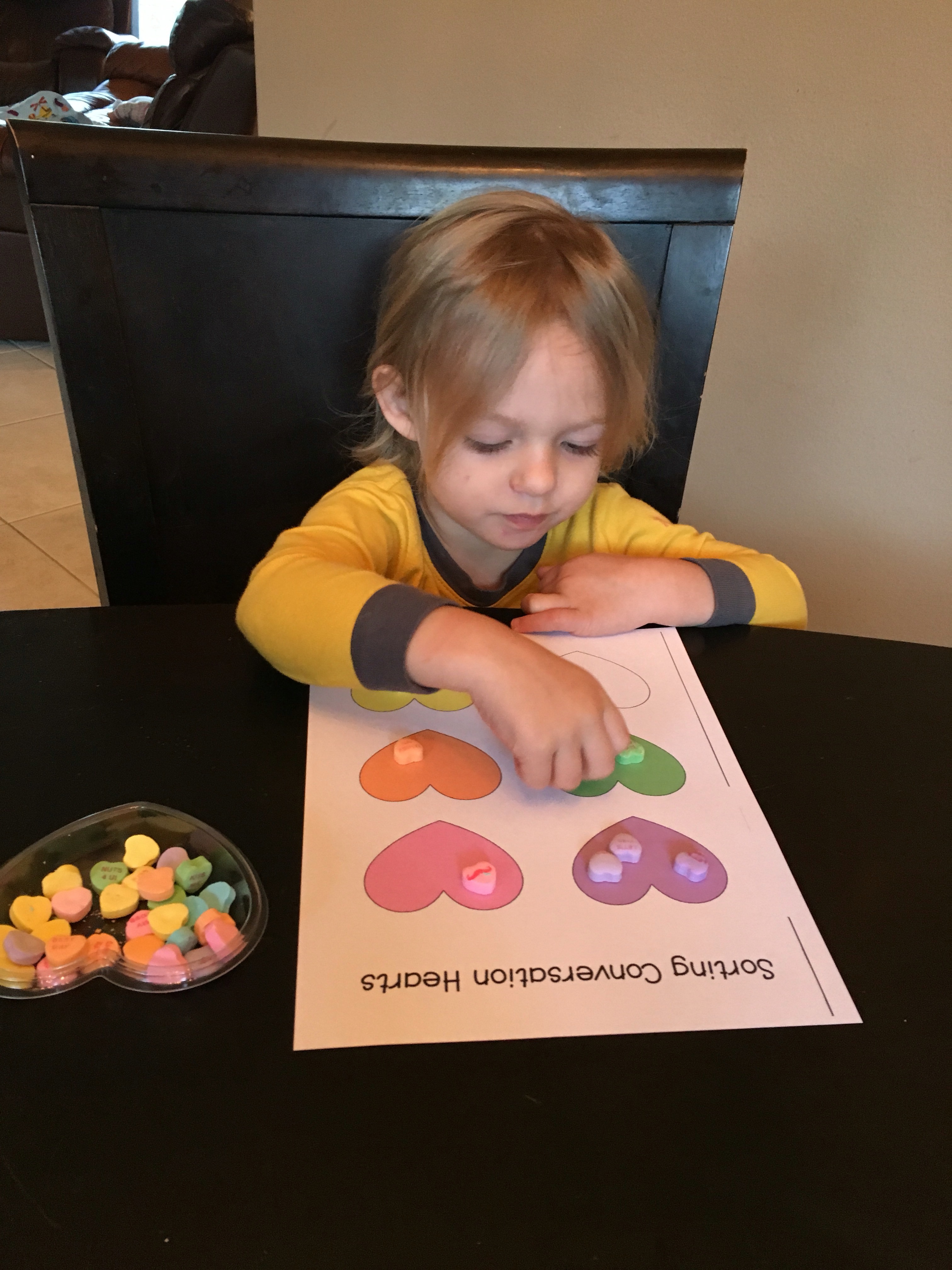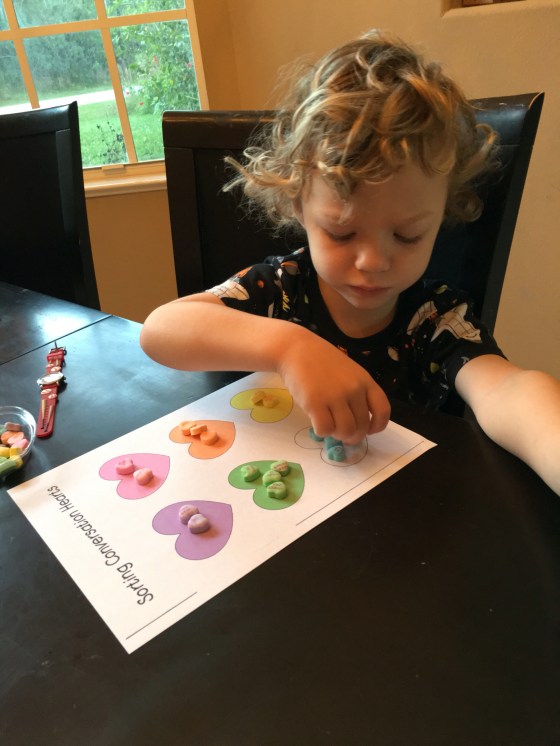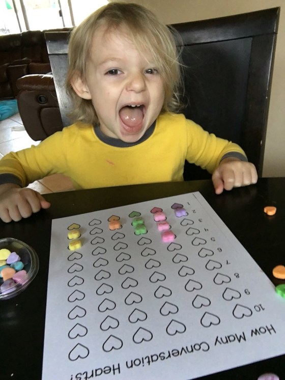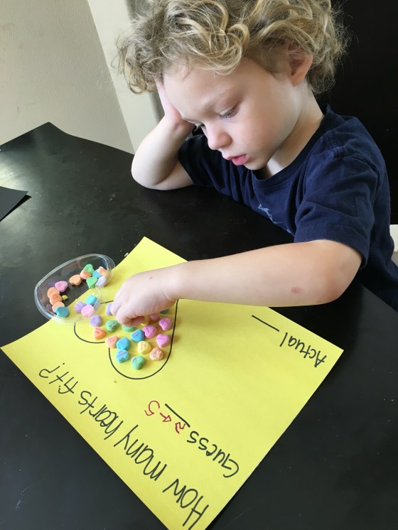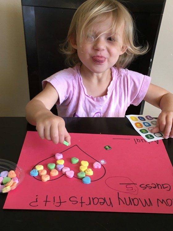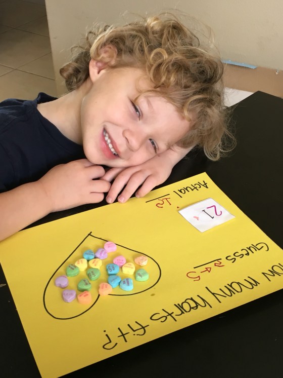 We did some candy math. They had to guess how many hearts fit into a big heart. They both guessed 5.