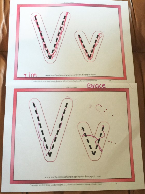 We traced the letter Vv and did a handwriting worksheet. Timmy does these perfectly now and of course Grace is still just learning.