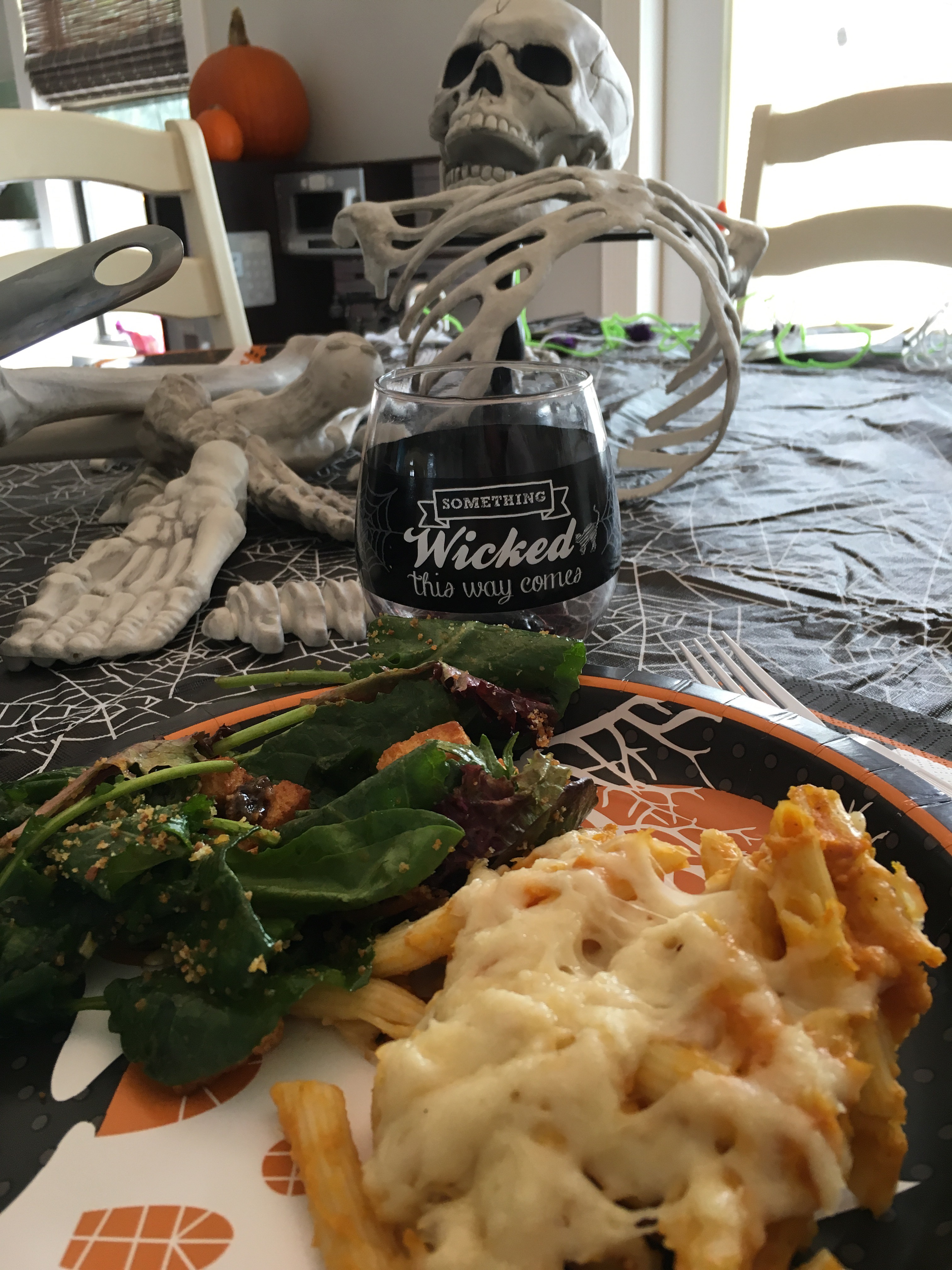 Us moms enjoyed some vino and some pumpkin bacon pasta.