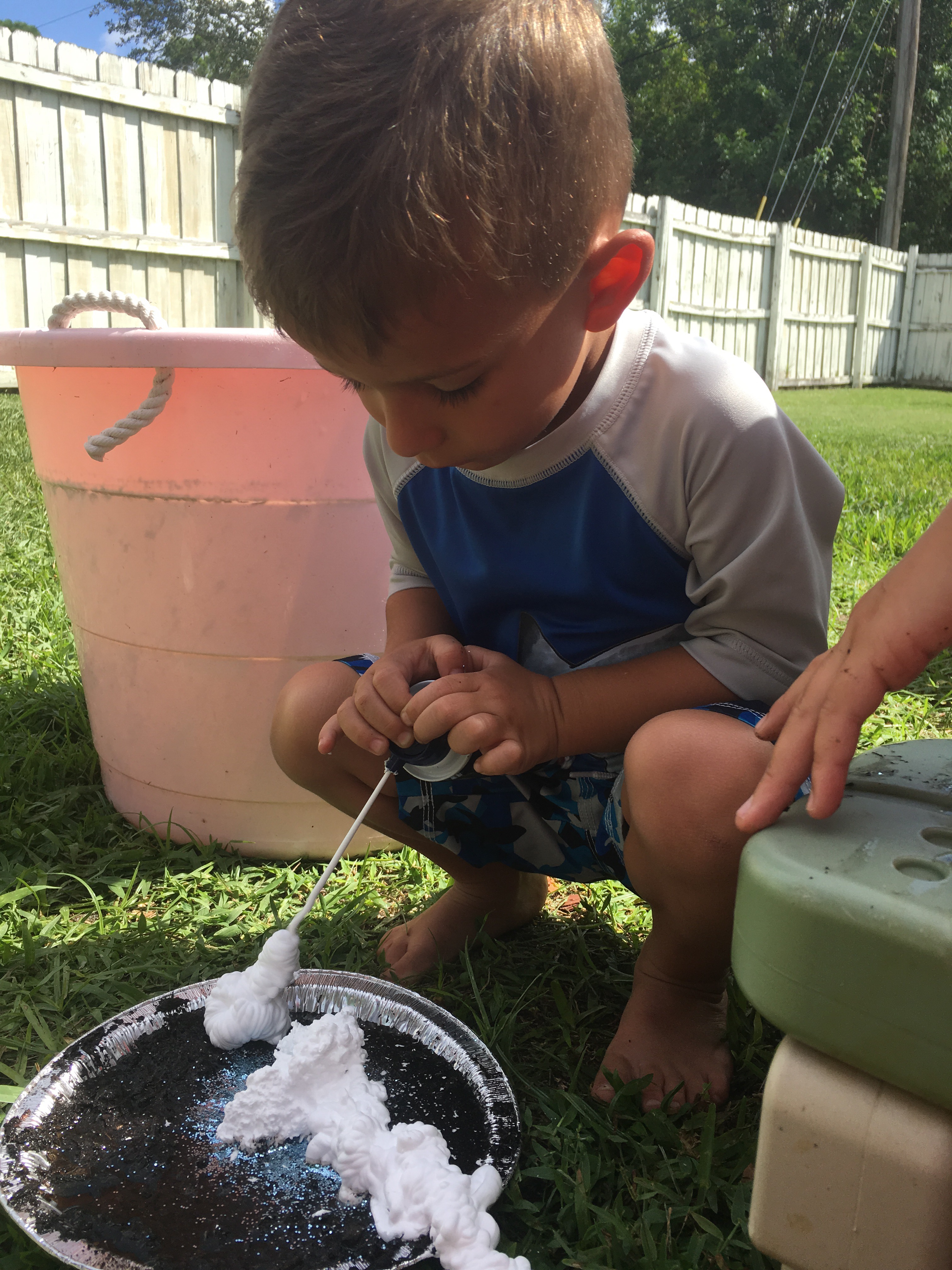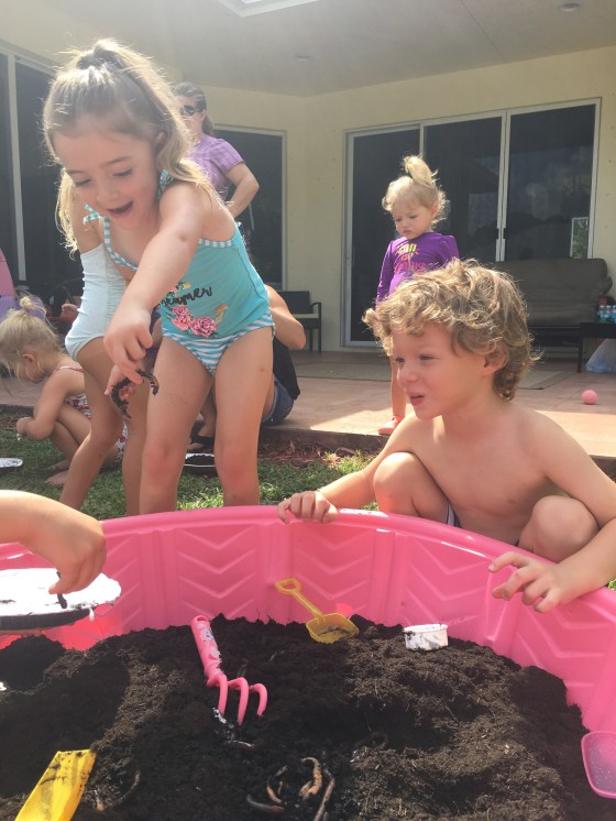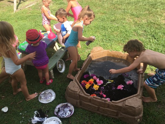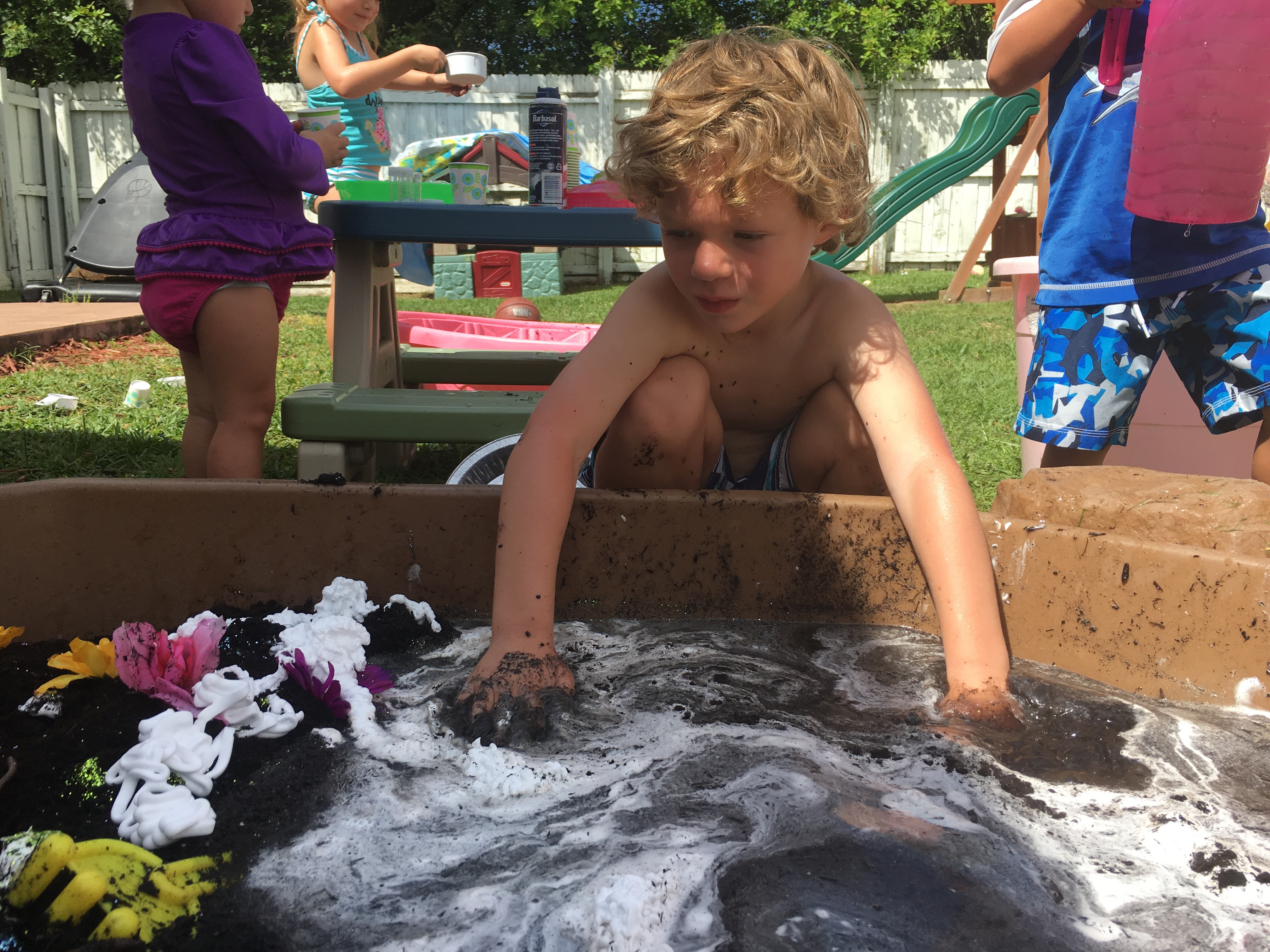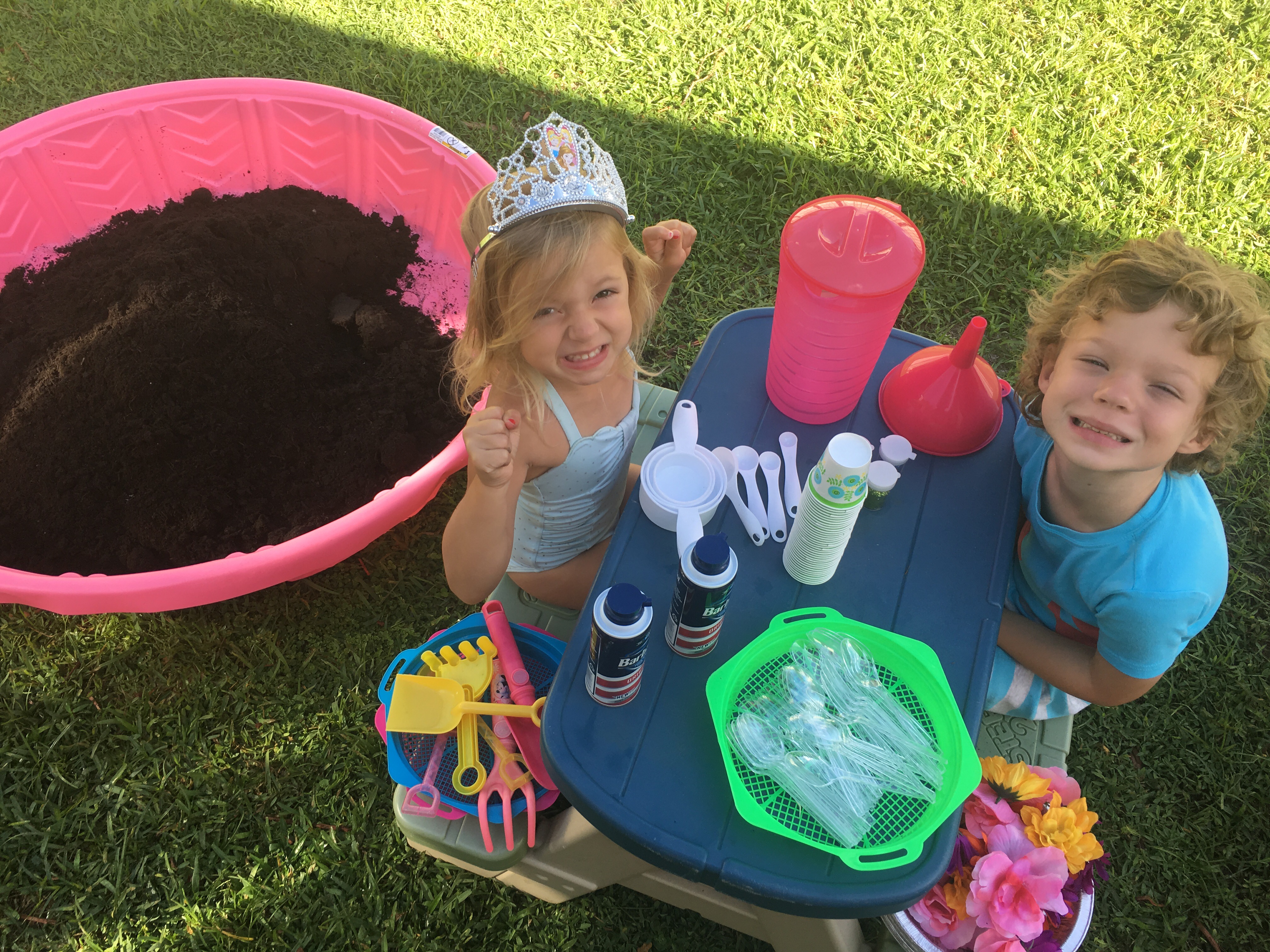 I filled our sand box and our baby pool with organic kid safe soil from Home Depot. I bought 2 bags but 1 would have been enough. Then I filled a huge tub with water.