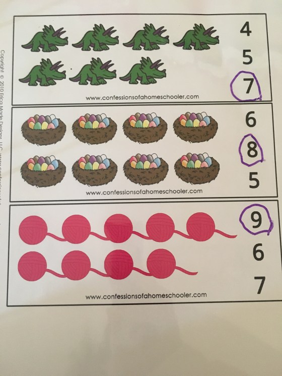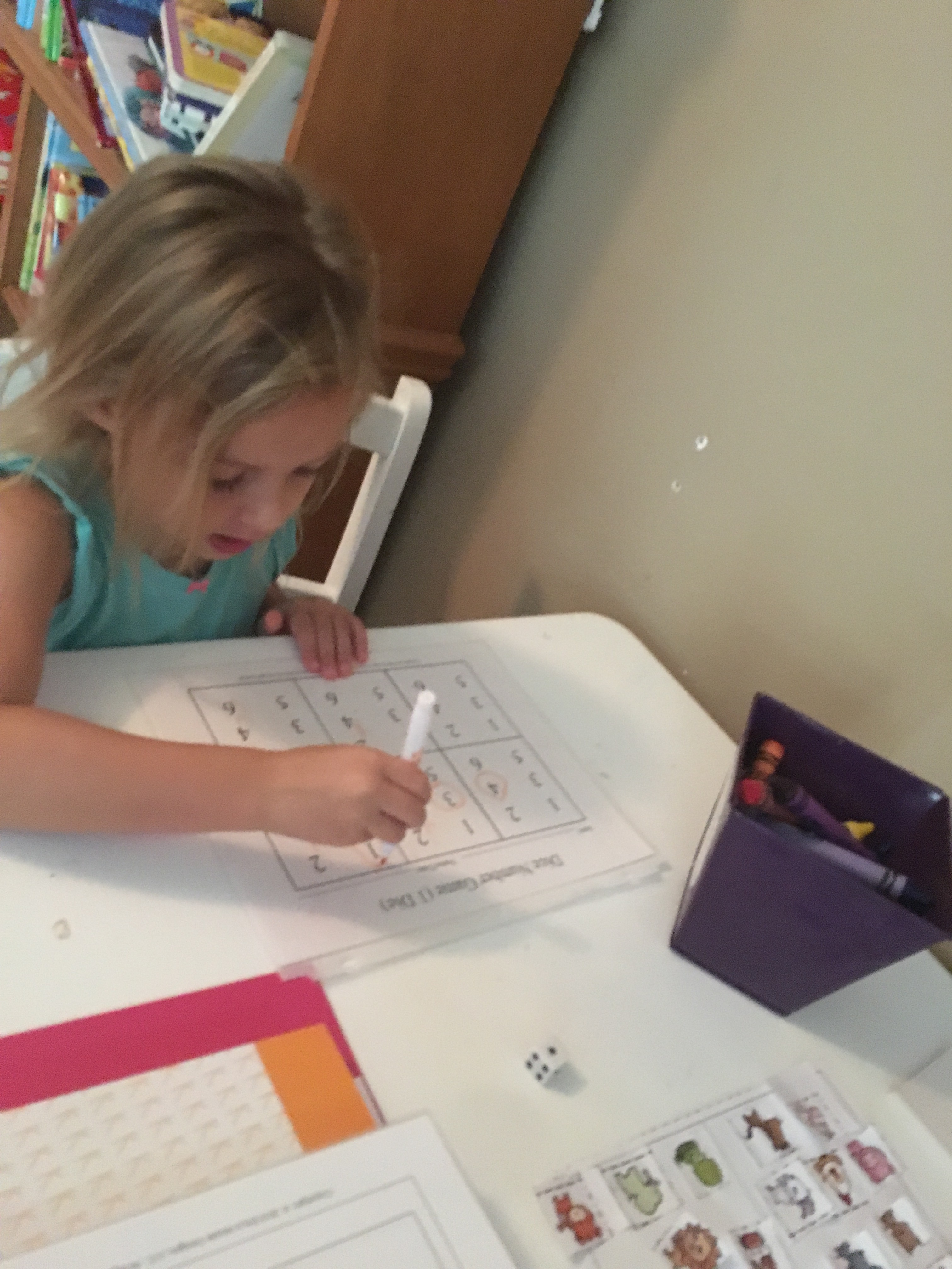 For math Grace had to roll a dice and cross off the numbers as she went.